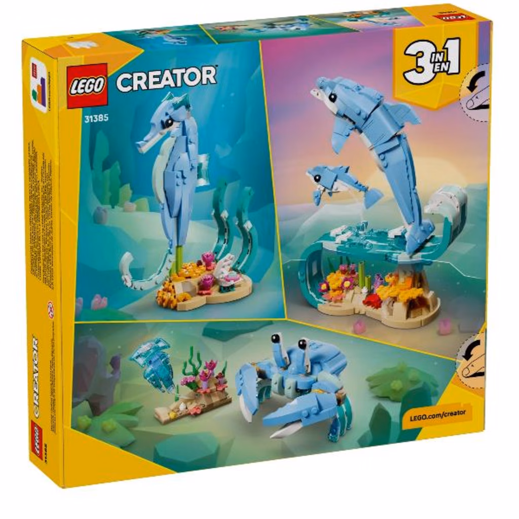Animali marini: meravigliosi delfini LEGO® Creator (31385) consente ai bambini dai 9 anni in su di inventare storie divertenti. Questo set di gioco con animali marini per i bambini e le bambine offre 3 diverse opzioni di costruzione con lo stesso set di mattoncini. Possono scegliere di costruire un modello dinamico di un delfino adulto e di un piccolo con caratteristiche snodabili che cavalcano un onda sopra il corallo. Può essere ricostruito in un cavalluccio marino snodabile su un colorato supporto con alghe e una conchiglia snodabile, o in un granchio accanto a piante marine e una medusa. Una volta terminato il gioco, ogni bellissimo modello può essere esposto con orgoglio come bellissima decorazione naturale su uno scaffale o una scrivania. Questo set LEGO Creator 3 in 1 ispirerà la tua immaginazione ed è una fantastica idea regalo per i bambini che amano gli animali marini. I bambini possono costruire ciascun playset con sicurezza utilizzando l app LEGO Builder: ingrandisci, ruota in 3D e tieni traccia dei progressi con istruzioni digitali facili da seguire. I modelli non possono essere costruiti simultaneamente.