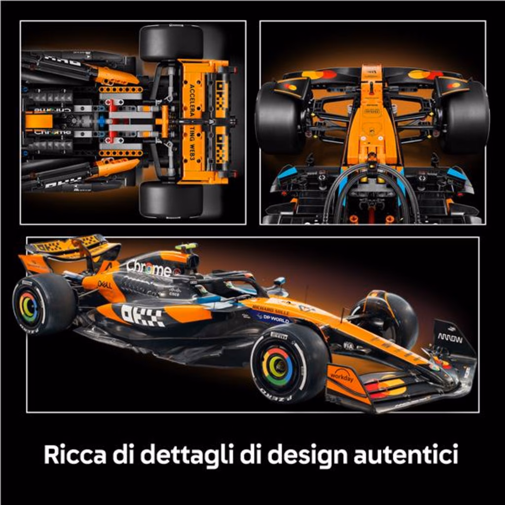 Corri verso la gloria con questo dettagliato modello Auto McLaren MCL39 F1® LEGO® Technic per adulti (42228). Questo set è una fantastica idea regalo per gli appassionati degli sport motoristici e offre un esperienza di costruzione stimolante e gratificante che consente di ricreare le caratteristiche dettagliate di questo modello di auto F1® in scala 1:8. Assembla i dettagli dell Auto McLaren MCL39 F1® 2025 costruendo lo sterzo, le sospensioni, il cambio e il differenziale. Attiva il DRS, quindi rimuovi la cover motore per esaminare il motore V6. Assapora la vittoria esponendo il modello in pole position come omaggio alla tua passione per la F1®. Costruisci il garage dei tuoi sogni con la collezione di set di veicoli LEGO Technic per adulti (ciascuno venduto separatamente). Divertiti a costruire con l app LEGO Builder, ingrandisci e ruota il modello con le istruzioni 3D e salva e tieni traccia dei progressi, il tutto dall app.