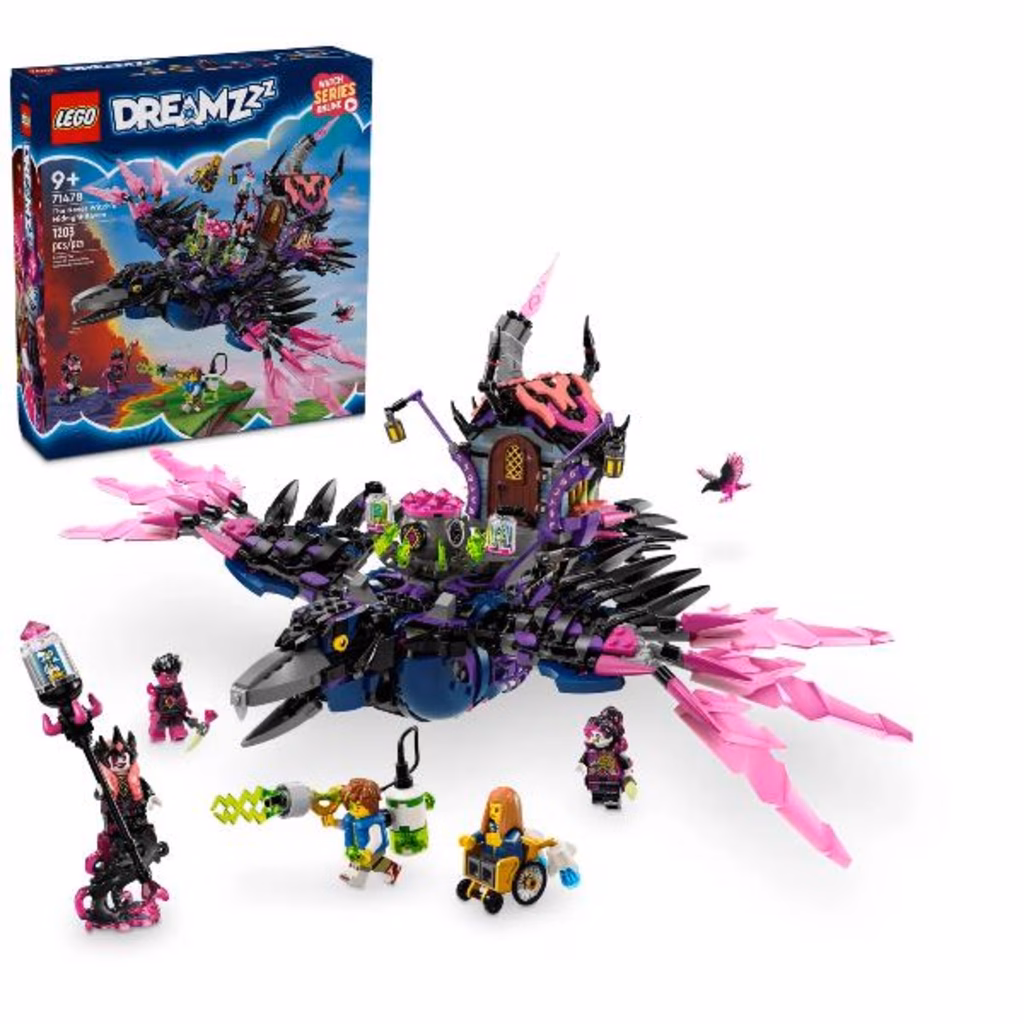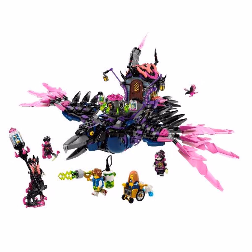 I giovani sognatori si divertiranno a costruire il malvagio corvo della Mai-Strega e quindi a trasformarlo in una capanna-corvo o in una collezione di 3 creature da incubo: una casa ambulante, un ragno calderone e un corvo gigante! La casa giocattolo è dotata di tetto e porta apribili, il ragno giocattolo ha una gabbia e gambe mobili e il corvo giocattolo ha ali e piume snodabili.