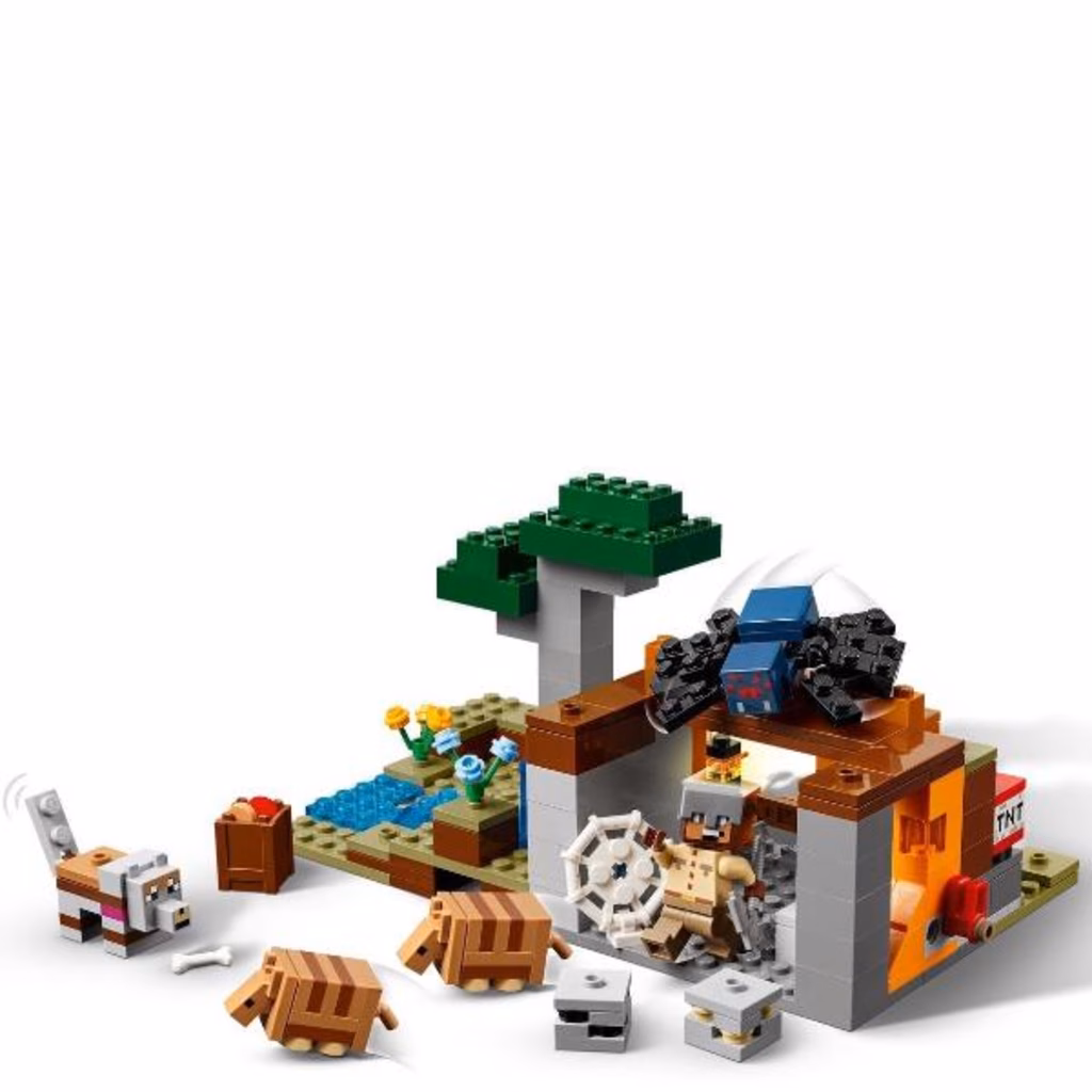 Ambientato nel bioma della savana del gioco, il modello presenta una miniera con una funzione di esplosione controllata da una leva che consente di far saltare in aria un pezzo di terreno per rivelare il prezioso minerale. C è un ragno delle caverne giocattolo e un lupo, più 2 armadilli, che forniscono lo scuto necessario per craftare l armatura del lupo. A lato della miniera ci sono un piccolo fiume e una cascata di lava.Il set si riorganizza facilmente per ispirare nuove avventure. Per un divertimento ancora più digitale, l app LEGO Builder consente ai bambini di ingrandire e ruotare i modelli in 3D utilizzando il proprio dispositivo.