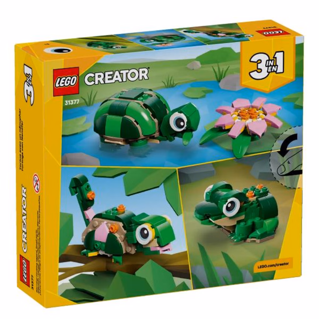 Il set costruibile Tartaruga con un fiore di ninfea LEGO® Creator 3 in 1 (31377) consente ai bambini dai 7 anni in su di raccontare storie di animali creative. Questo simpatico animale giocattolo per i bambini e le bambine offre 3 diverse opzioni di costruzione con lo stesso set di mattoncini. I bambini possono scegliere di costruire una tartaruga giocattolo con testa e bocca snodabili, e un bellissimo fiore di ninfea rosa. La tartaruga può quindi essere ricostruita in un camaleonte con testa e coda snodabili o in una rana con bocca mobile. Una volta terminato il gioco, ogni modello può essere esposto come divertente decorazione. Questo set LEGO Creator 3 in 1 ispirerà l immaginazione dei bambini ed è un fantastico regalo per i bambini ele bambine che amano il gioco di finzione e gli animali selvatici. E con l app LEGO Builder, i bambini vivranno un avventura di costruzione facile e intuitiva. Possono ingrandire e ruotare i loro set utilizzando le istruzioni per la costruzione 3D, ten ere traccia dei loro progressi e salvarli in un unico posto. I modelli non possono essere costruiti simultaneamente.
