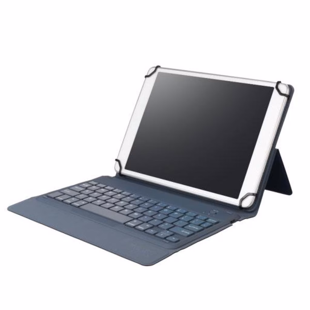 Cover universale per tablet da 10.5" con tastiera integrata Bluetooth. I quattro ganci interni regolabili bloccano il tablet creando un ancoraggio perfetto. Il lato posteriore ha un supporto per la funzione di stand up e la copertina presenta una chiusura magnetica. L'interno, vellutato, protegge il tablet da eventuali graffi. Batteria della tastiera Bluetooth al litio.