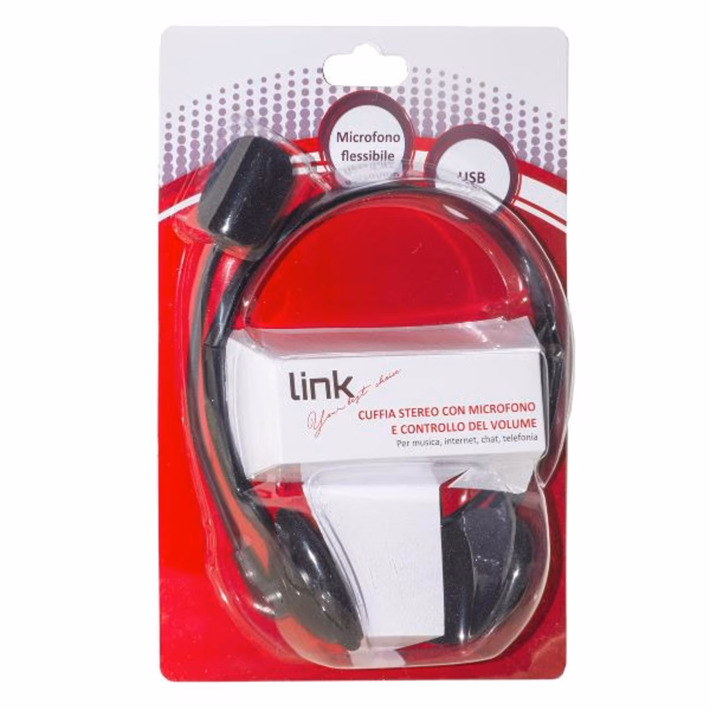 CUFFIA STEREO CON MICROFONO ORIENTABILE CON CONNETTORE USB Cuffia con due auricolari e microfono, molto leggera, con unico connettore USB per audio e microfono.Lunghezza cavo mt 1,80 Si collega alla porta USB, si può quindi usare con PC o notebook senza scheda audio.Con controllo volume integrato nel filo, per la regolazione al livello ottimale.La presenza del microfono, il controllo volume e i due auricolari rendono questa cuffia ideale per una varietà di usi: ascoltare musica, chat su internet, telefonia.CARATTERISTICHE CUFFIE: Due auricolari da 30 mm.Impedenza: 32 Ohm +/-15% Sensibilità: 97 Db +/- 3 Db Frequenza: 20-20000 Hz Ingresso potenza massimo: 40 mw Connettore: USB tipo A maschio CARATTERISTICHE MICROFONO: impedenza: 2,2 K Sensibilità: 58 Db +/- 2 Db Risposta in frequenza 30-16000 Hz