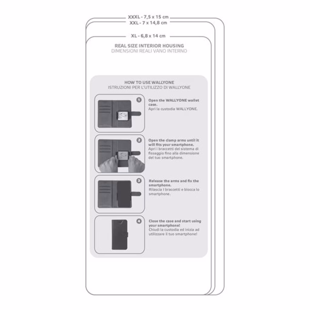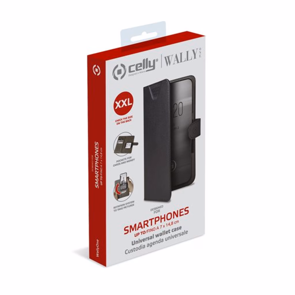 WALLY ONE è la custodia a libro universale, disponibile in 3 diverse taglie, che grazie al sistema di fissaggio universale, si adatta ad ogni tipo di telefono.