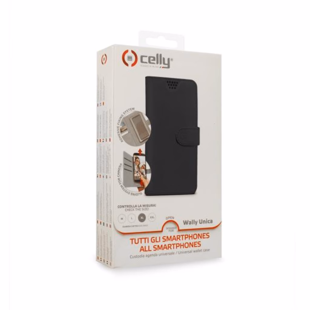 WALLY UNICA è la custodia a libro universale, disponibile in quattro diverse taglie, che grazie al sistema adesivo in silicone (rigenerabile e che non lascia residui), si adatta ad ogni tipo di telefono.