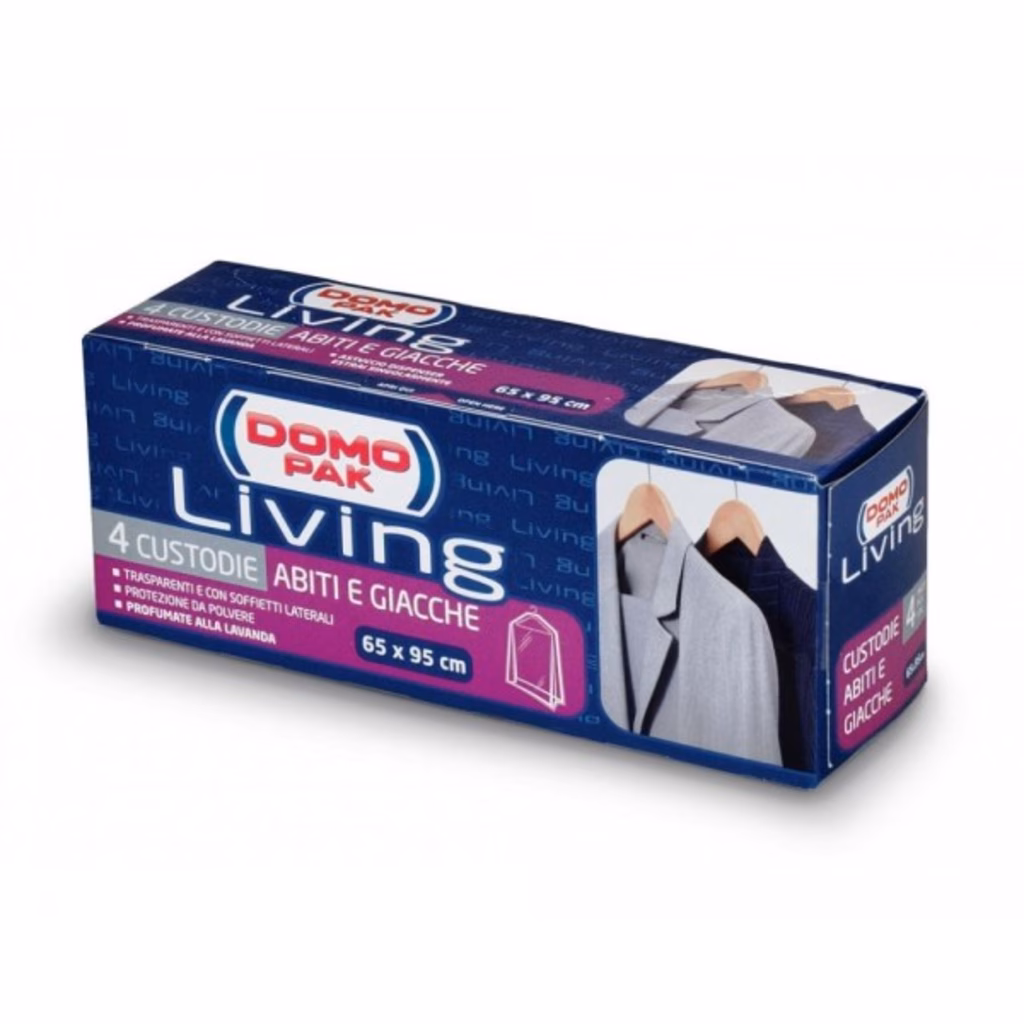 Le Custodie antipolvere Domopak Living permettono ai capi di restare protetti e puliti a lungo isolandoli dalla polvere, dagli agenti esterni e dagli insetti. Indispensabili negli armadi ma anche in viaggio.