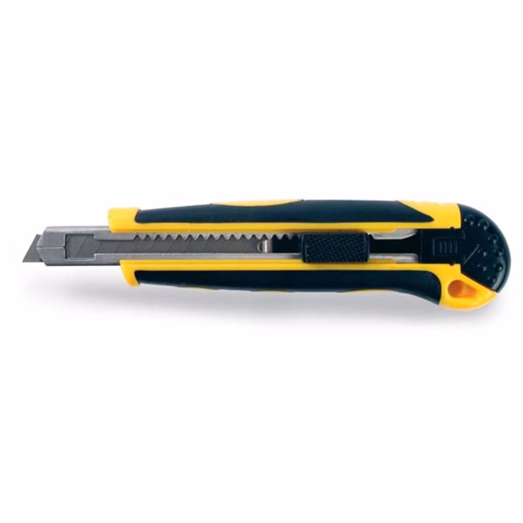 Corpo in plastica con telaio in acciaio inox antiruggine - impugnatura ergonomica in gomma - cursore a scorrimento morbido con click sonoro - meccanismo autobloccante della lama - pratico cassetto per scorta lame