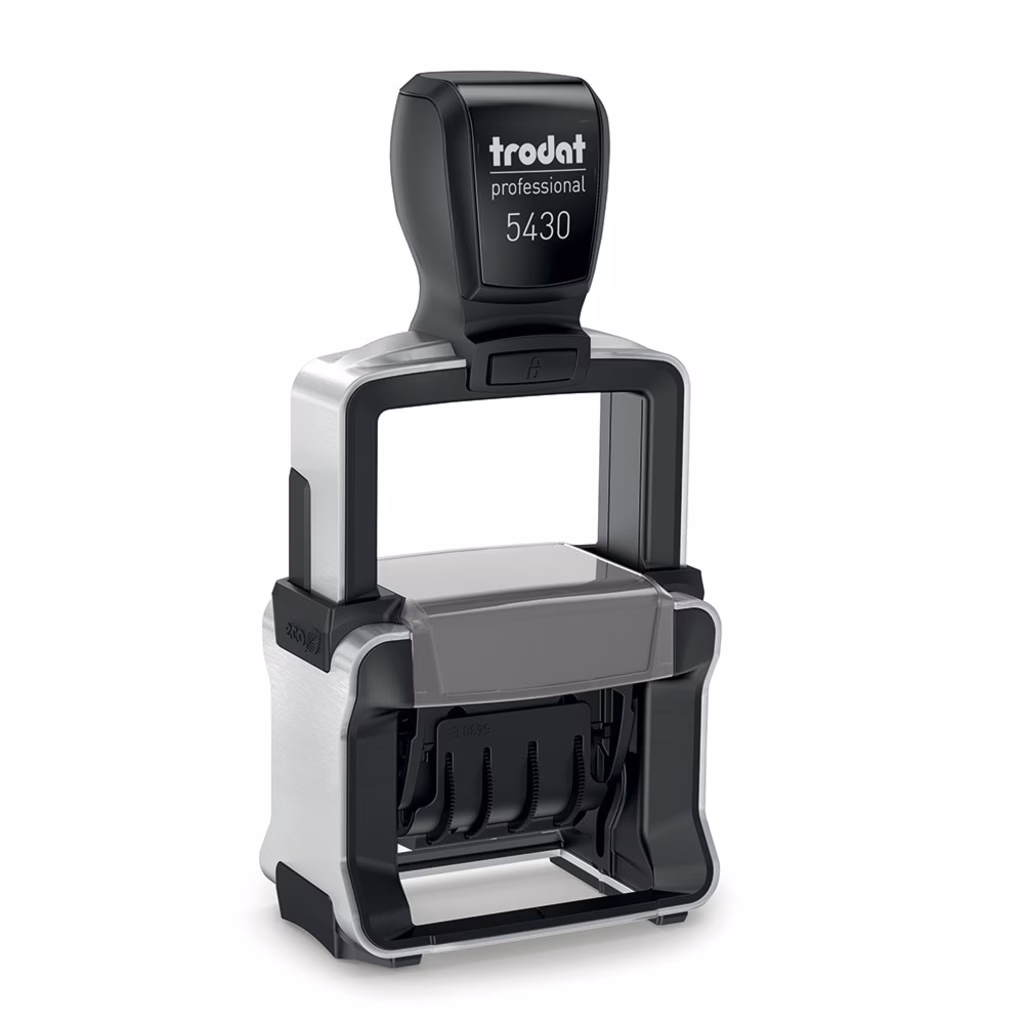Datario autoinchiostrante per uso intensivo in semplicità e con poca fatica. Impugnatura ergonomica con elementi soft touch. Dimensioni ridotte e notevole leggerezza. Elevatissima stabilità e resistenza grazie alla struttura in acciaio inox. Copertura delle bande per un'impostazione della data rapida e pulita. Nuove rotelle di avanzamento più ampie e morbide. Datario dodecennale. Sostituzione della cartuccia più semplice e pulita grazie a speciali impugnature. Altezza data 4 mm A) 5430/L: con 3 testi intercambiali RICEVUTO-PAGATO-REGISTRATO; B) 5460/L: datario autoinchiostrante con 2 diciture a scelta RICEVUTO o PAGATO. Data garantita per i successivi 12 anni.