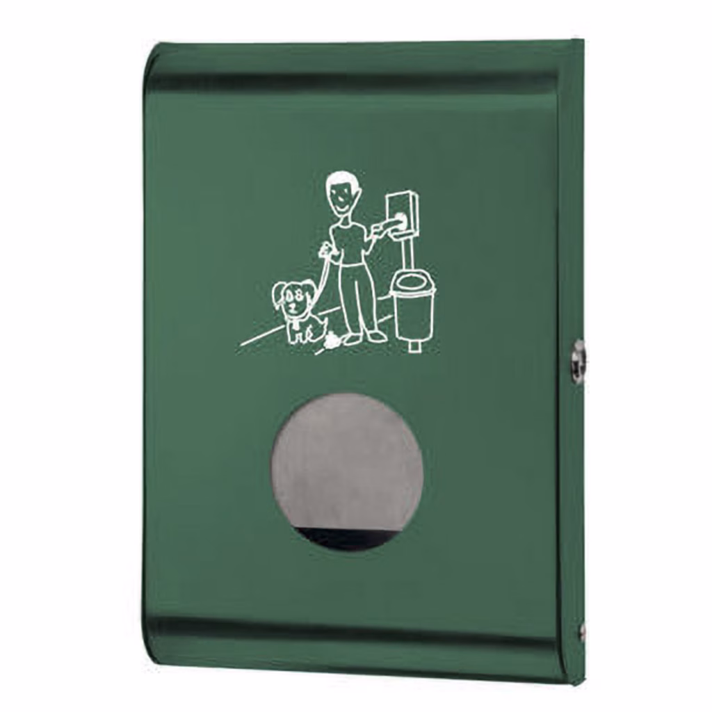 Distributore di sacchetti per deiezioni canine - metallo verniciato verde - distributore in Acciaio inox o acciaio galvanizzato a caldo; finitura satinata o verniciatura epossidica; foro frontale per l'erogazione dei sacchetti; capacità massima: 600 sacchetti; chiusura con chiave triangolare.