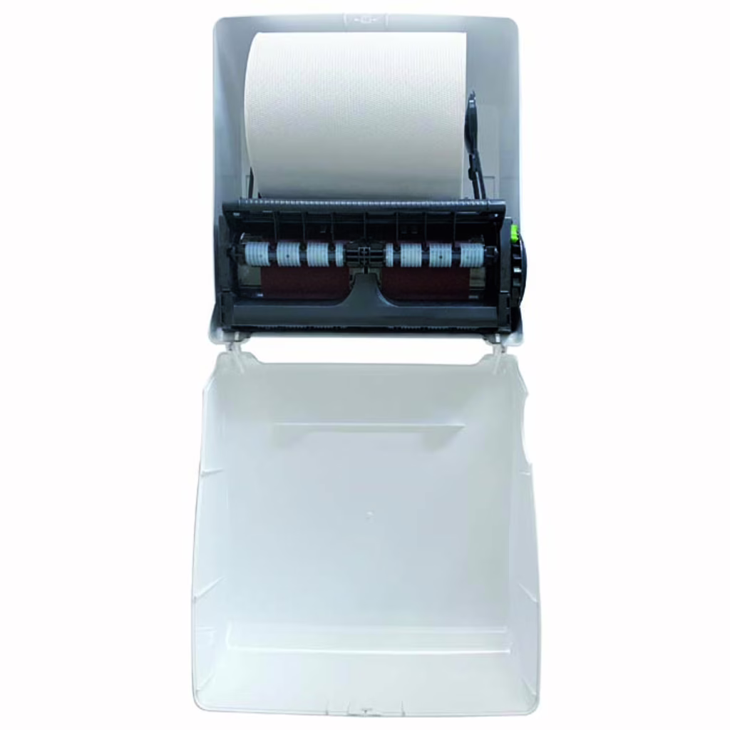 Dispenser semiautomatico di carta asciugamani in rotoli con tencologia AutoCut - basta tirare un lembo di carta e si otterrà immediatamente un comodo servizio da cm 24 - serratura con bottone per un utilizzo più facile e veloce in sede di manutenzione - gruppo di taglio brevettato che consente una distribuzione costante della forza di trazione - tasselli di fissaggio inclusi - accetta solo rotoli larghezza cm 21,30 (cod. IC01109)