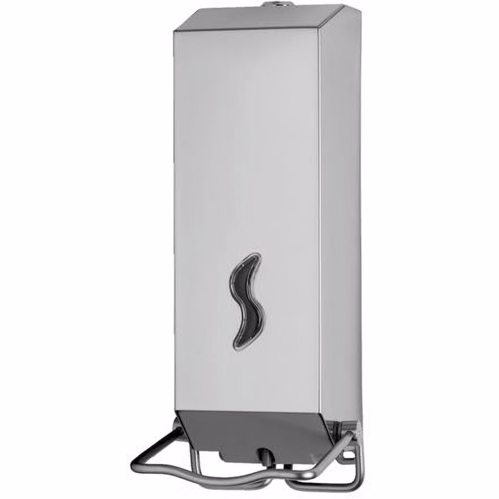 Distributore con serbatoio in plastica a riempimento da 1,2 litri per tutti i tipi di sapone liquido, salvo quelli con microgranuli - sistema di erogazione con leva azionabile a gomito - finestra per il controllo del livello del sapone - serratura antivandalo in metallo - kit d'installazione incluso
