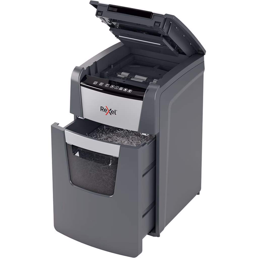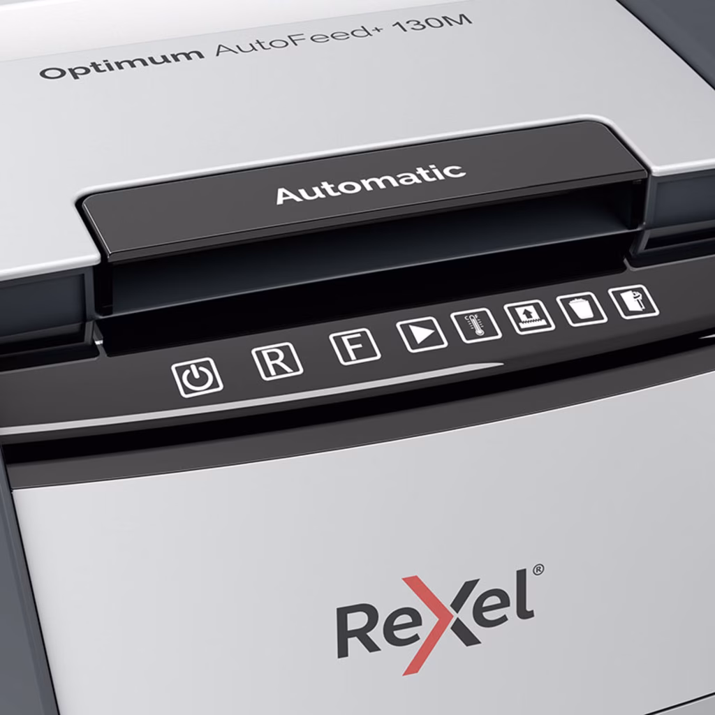 Distruggidocumenti Optimum AutoFeed+ 130M automatico. Distrugge fino a 130 fogli A4 alla volta con sistema automatico. Distruggidocumenti con taglio a frammenti e con livello di sicurezza P-5.