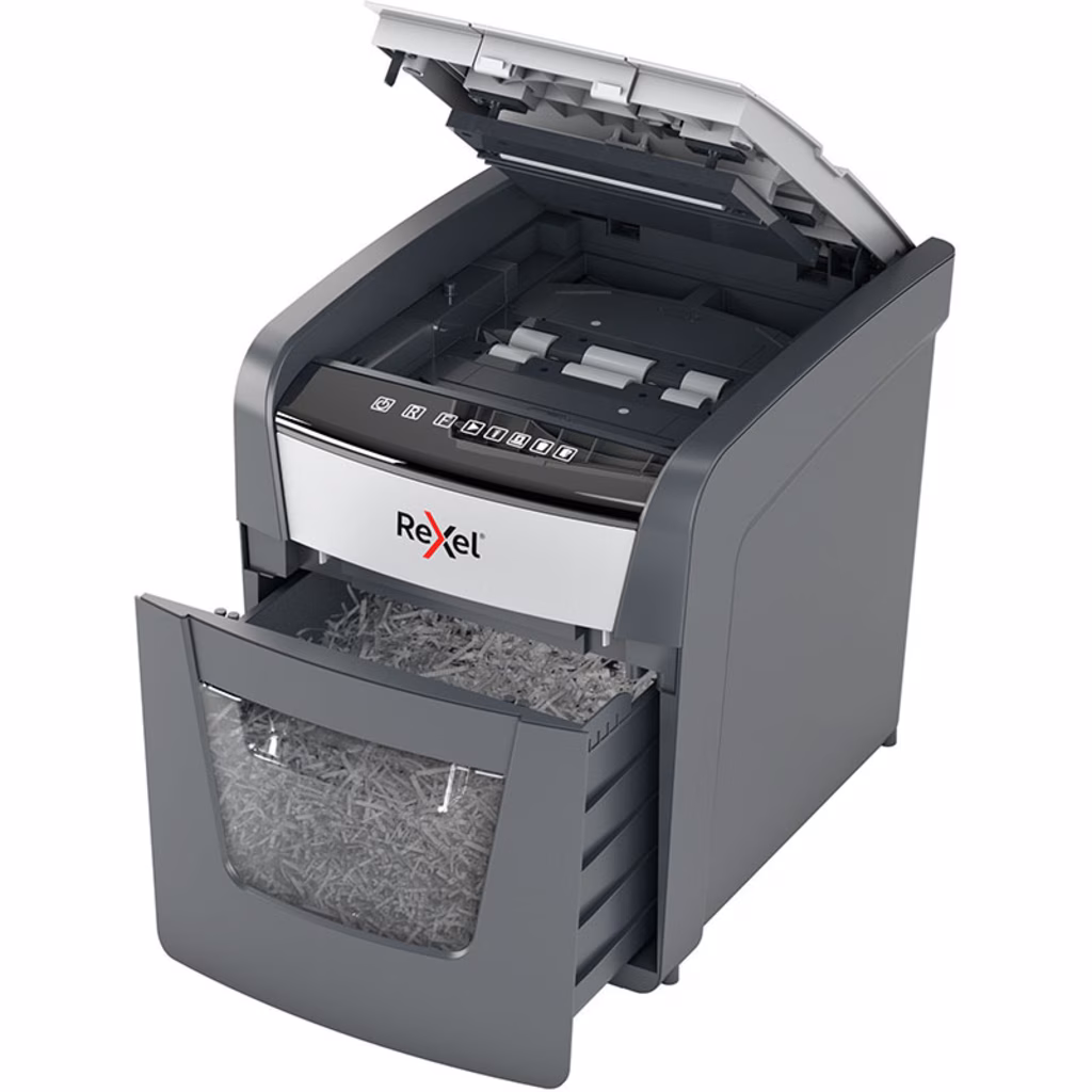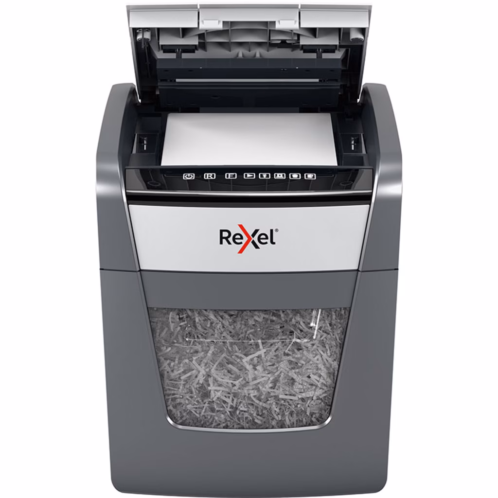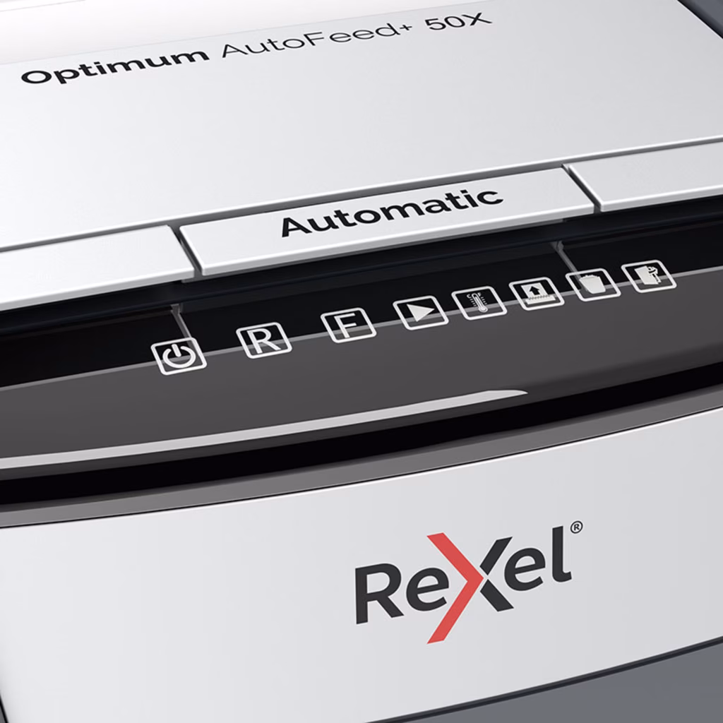 Distruggidocumenti Optimum AutoFeed+ 50X automatico. Distrugge fino a 50 fogli A4 alla volta con sistema automatico. Distruggidocumenti con taglio a frammenti e con livello di sicurezza P-4