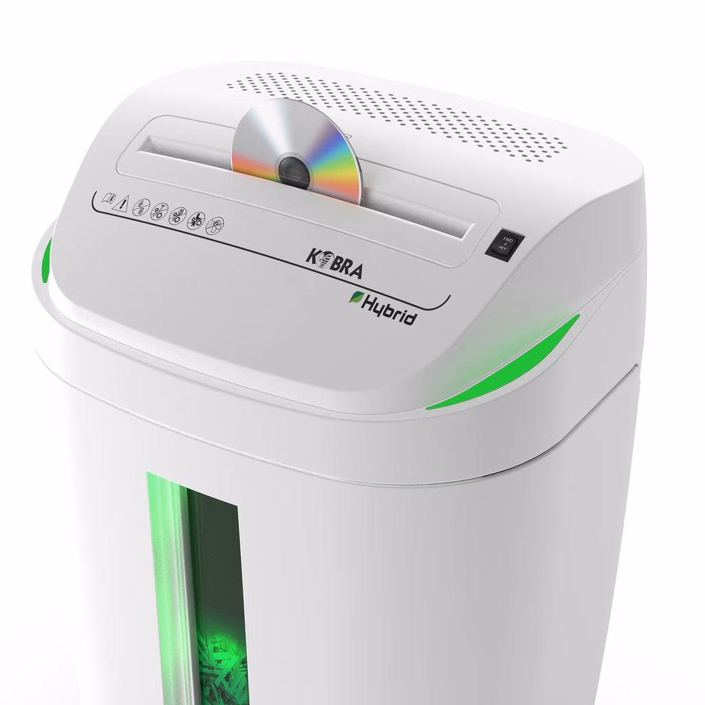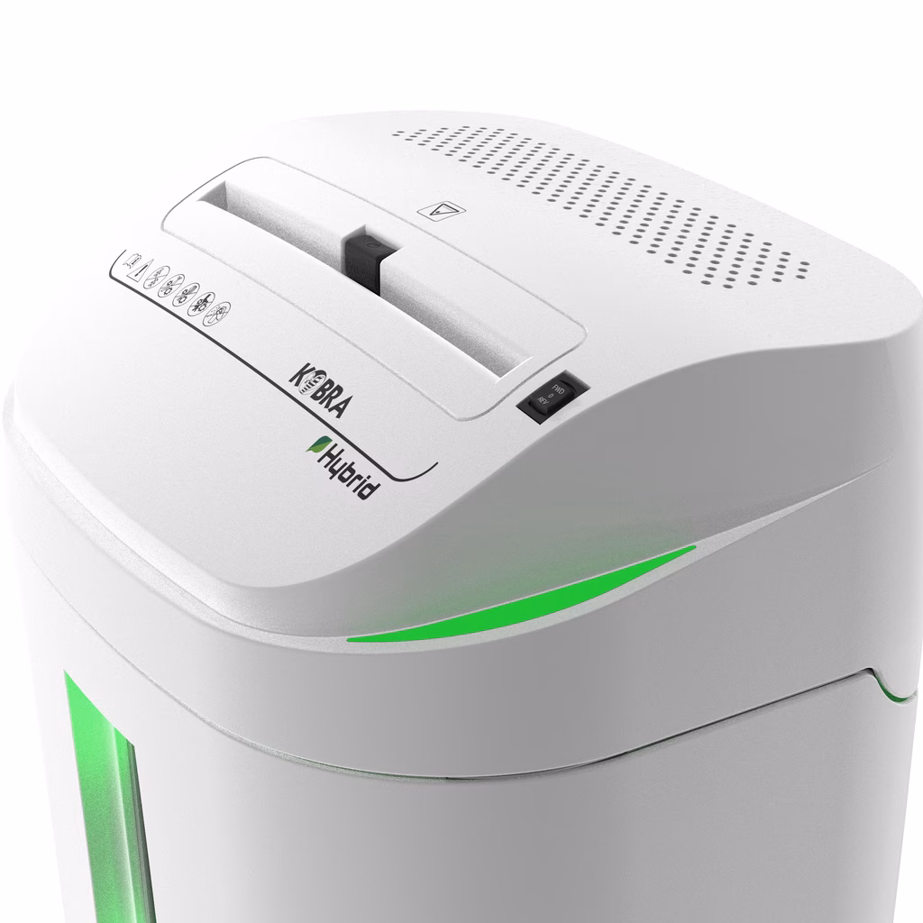 Distruggidocumenti dal design moderno, KOBRA S4-HYBRID è un innovativo distruttore equipaggiato con l'esclusiva tecnologia ibrida per il controllo dell'energia. "Hybrid Power Managemet System" consente fino al 15% di distruzione tramite l'energia accumulata: questa tecnologia esclusiva permette il funzionamento tramite l'utilizzo di energia accumulata durante il funzionamento e in seguito il distacco automatico dalla rete a fine distruzione per zero consumi elettrici. KOBRA S4-HYBRID è in grado di distruggere fino a 22 fogli di carta alla volta, CD/DVD e carte di credito. Una meccanica affidabile e durevole con motore ad alta efficienza a funzionamento continuo 24h/24 senza surriscaldamenti e coltelli in acciaio temprato, non danneggiabili da punti metallici e graffette, assicurano prestazioni impareggiabili, unitamente a un design e tecnologia LED esclusivi. Funzionalità "Oil-Free": nessuna necessità di lubrificazione delle lame di taglio. Il comodo contenitore è estraibile senza sollevare il corpo macchina, ha una finestra anteriore trasparente e illuminata per il controllo del livello di riempimento e non richiede sacchetti. Uno speciale dispositivo rileva l'estrazione del cesto e ferma automaticamente il gruppo di taglio.