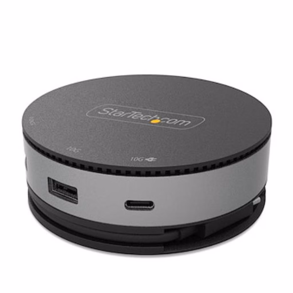 Questa docking station da viaggio USB-C è dotata di un design rotondo compatto e di un cavo host integrato lungo ben 24 cm per consentire un'ampia varietà di configurazioni. Grazie all'alimentazione tramite bus per la maggior parte delle applicazioni, evita la necessità di dover portare con sé un ingombrante adattatore di alimentazione separato. Se è necessaria un'alimentazione aggiuntiva, è possibile utilizzare l'adattatore di alimentazione esterno del computer laptop USB-C con supporto del pass-through Power Delivery fino a 75W (15W per la docking station e il resto per la ricarica).