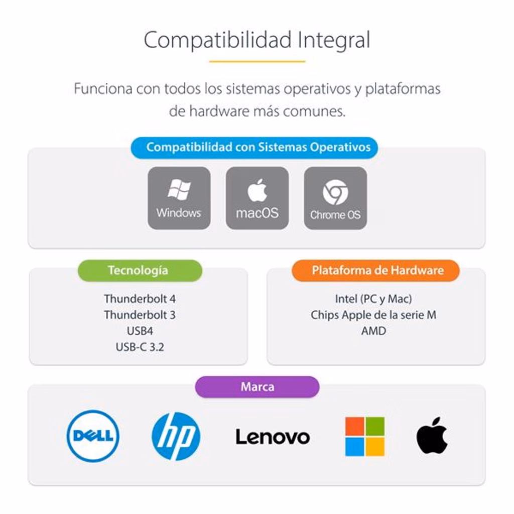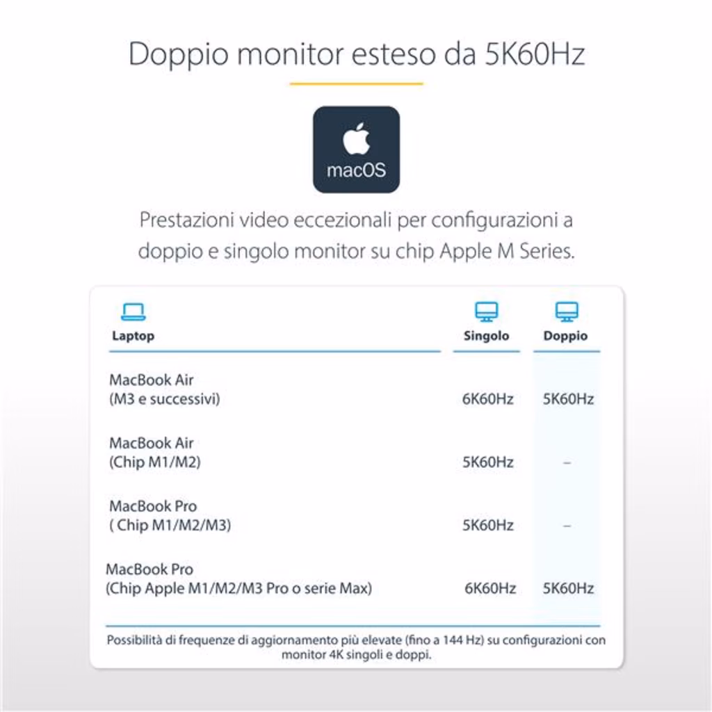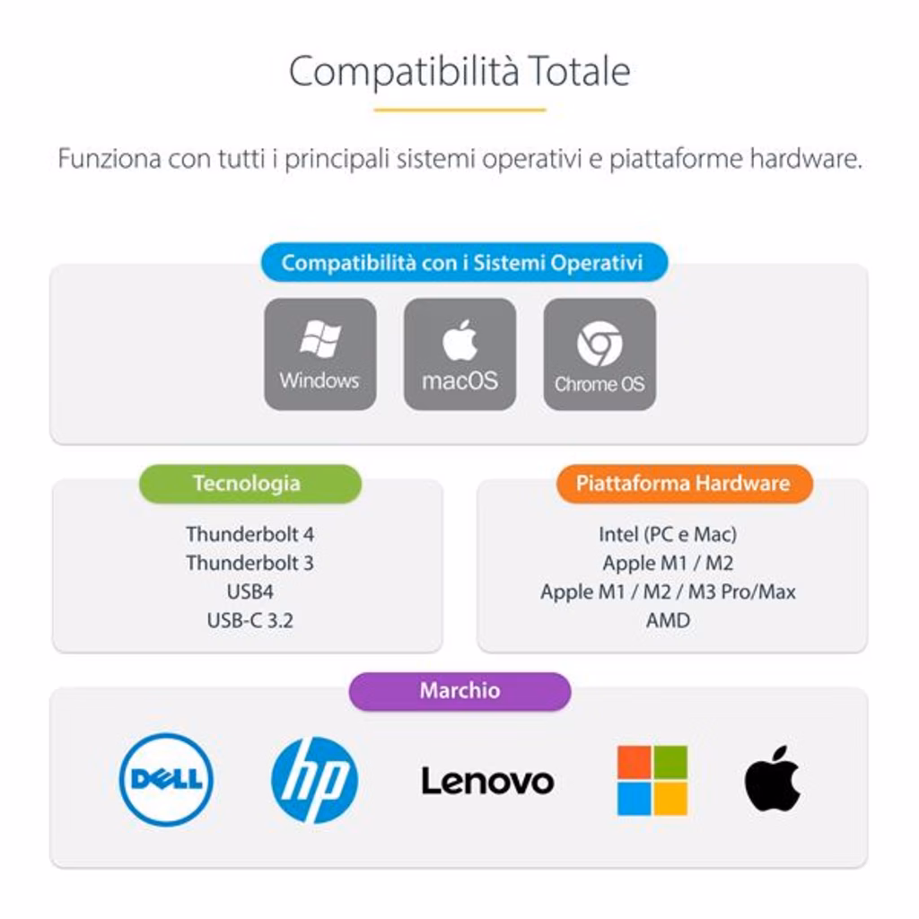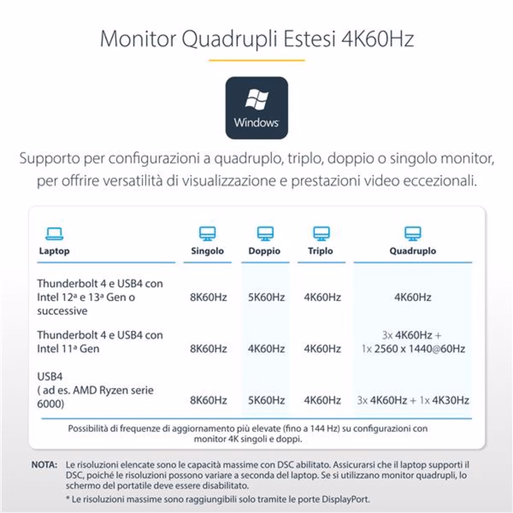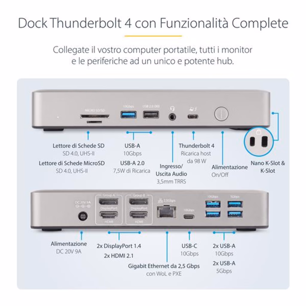 Trasformare Laptop Thunderbolt 4 in una workstation multi monitor ad alta risoluzione con 7 porte USB,  1 porta 2,5 Gigabit Ethernet, audio da 3,5 mm, oltre a USB Power Delivery e alla ricarica di dispositivi in downstreamDOCK THUNDERBOLT 4 AD ALTE PRESTAZIONI: configurazione senza driver; 2x DisplayPort; 2x HDMI; Hub USB a 7 porte (3x USB-A 10Gbps/1x USB-C 10Gbps/2x USB-A 5Gbps/1x USB 2.0); lettori di schede SD e mSD; 2,5GbE; K-Slot; jack per cuffie da 3,5 mmFLESSIBILITÀ MULTI-MONITOR: supporta fino a 4x display 4K 60Hz con CPU Intel di 12ª Gen (o superiore) che supportano DP 1.4 con DSC; 4x display a risoluzioni inferiori senza DSC o con CPU Intel di 11ª Gen (o inferiore); 1x display HDMI 8K 60Hz 4k 144HzCOMPATIBILITÀ: Windows, macOS e Ubuntu; funziona con tutti i laptop Thunderbolt 4/3 e USB4; display quadruplo sui laptop Windows; doppio display su MacBook Pro (Apple M1/M2/M3 Max e Pro); display singolo su MacBook Air98W POWER DELIVERY: include un adattatore di alimentazione per caricare simultaneamente il laptop (98W PD) e alimentare tutte le porte; la porta USB 2.0 supporta 7,5W (1,5A) per la ricarica di dispositivi mobili o altri dispositivi alimentati a batteriaVANTAGGI IT PRO: Include un cavo host TB4 da 1m; fori di montaggio per staffe opzionali (SSPMSVESA/SSPMSUDWM); K-slot; software Connectivity Tools con MAC Address Pass-Through, USB Event Monitoring, WiFi Auto Switching e utilità di layout di Windows