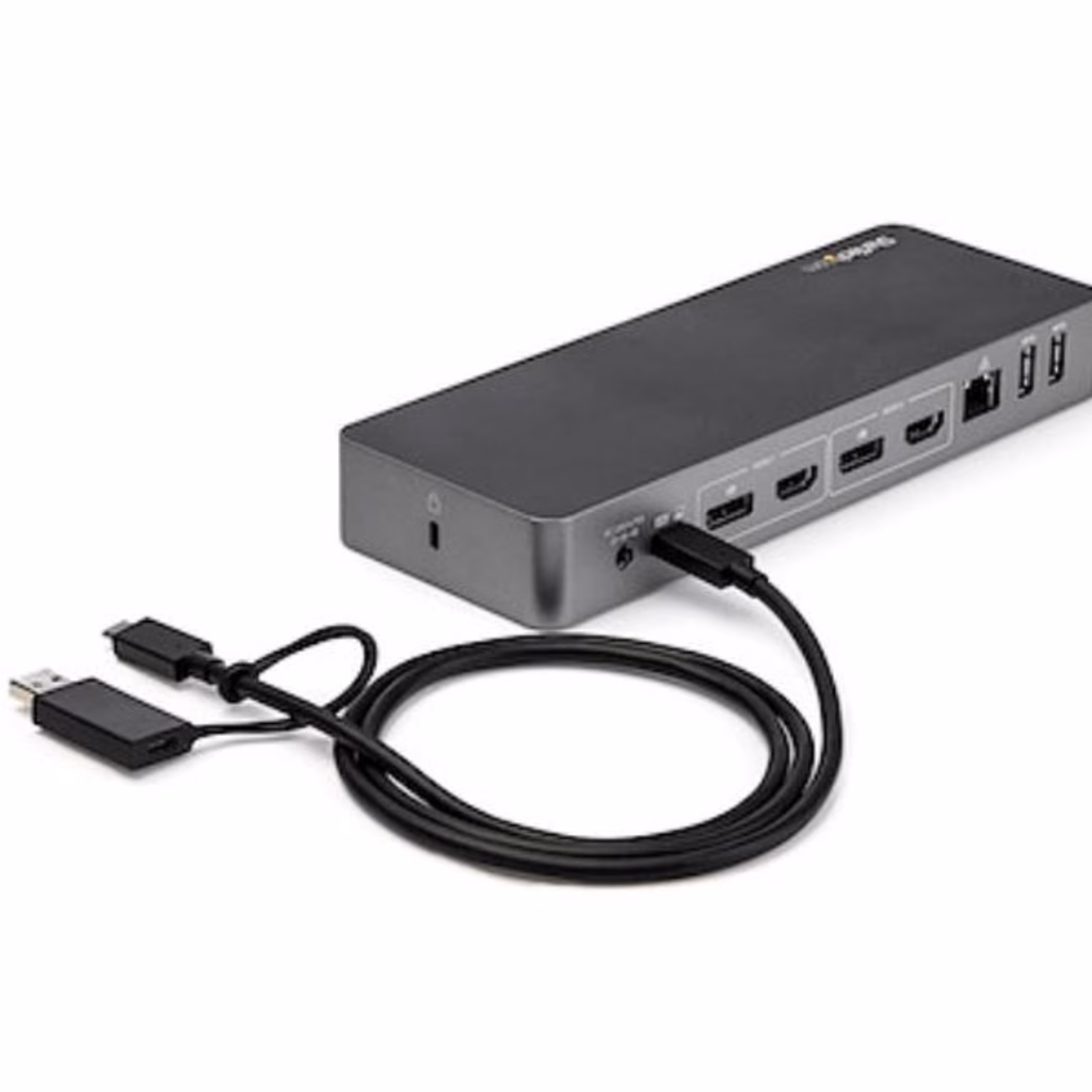 La dock USB-C è dotata di un cavo host universale progettato con un adattatore USB-C a USB-A integrato per il collegamento di computer laptop USB-A. Il cavo è inoltre dotato di una prolunga di 1 metro per supportare un'ampia varietà di configurazioni della workstation.