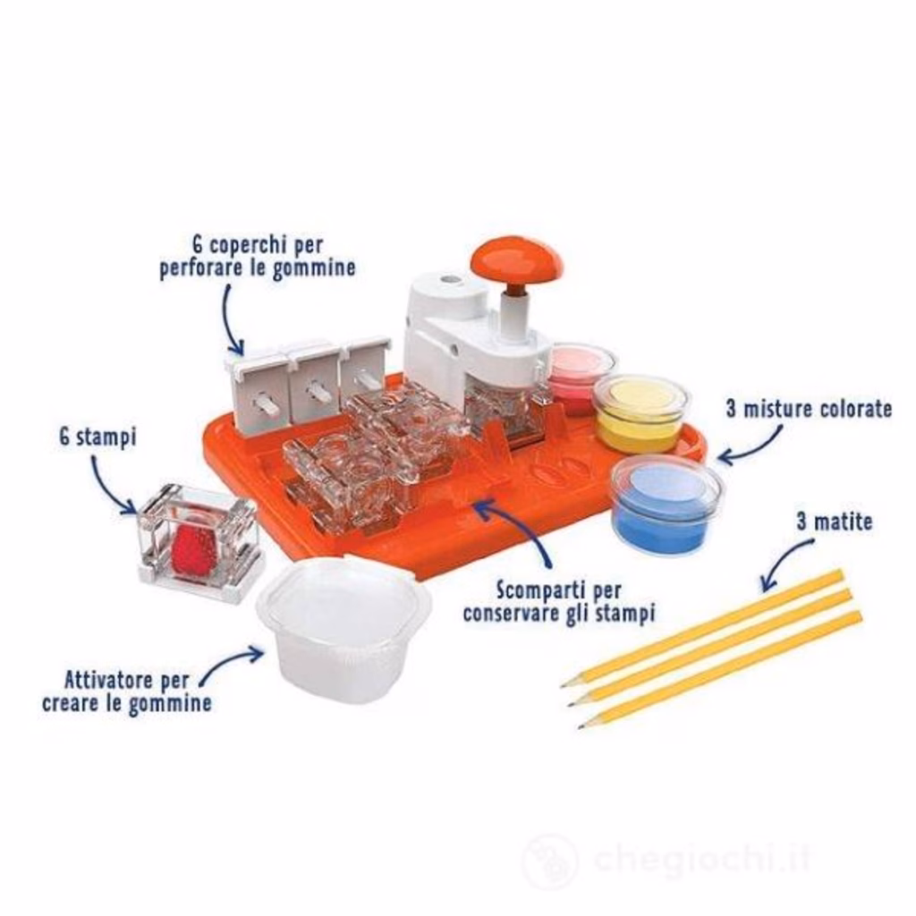 Una volta solidificata la mistura, le gommine funzioneranno veramente! Include 6 stampini di forme diverse (fragola, torta, smiley, fungo, pesciolino, e lumachina) e 3 barattolini di composto dei 3 colori primari per creare tantissime combinazioni strepitose!