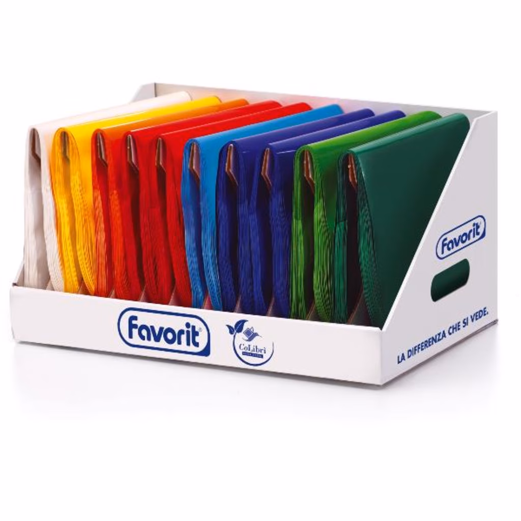 Espositore da banco in cartone, precaricato con 300 pezzi di coprimaxi laccati in polipropilene da 160 my, con alette ripiegate, tasche interne e portanome. Finitura coprente laccata lucida