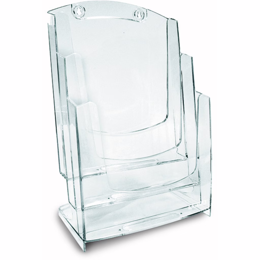 Robusto e ben stabile sul piano di appoggio - apendibile sulla parete - dorso leggermente inclinato e scanalature sul fondo per garantire stabilità al materiale esposto