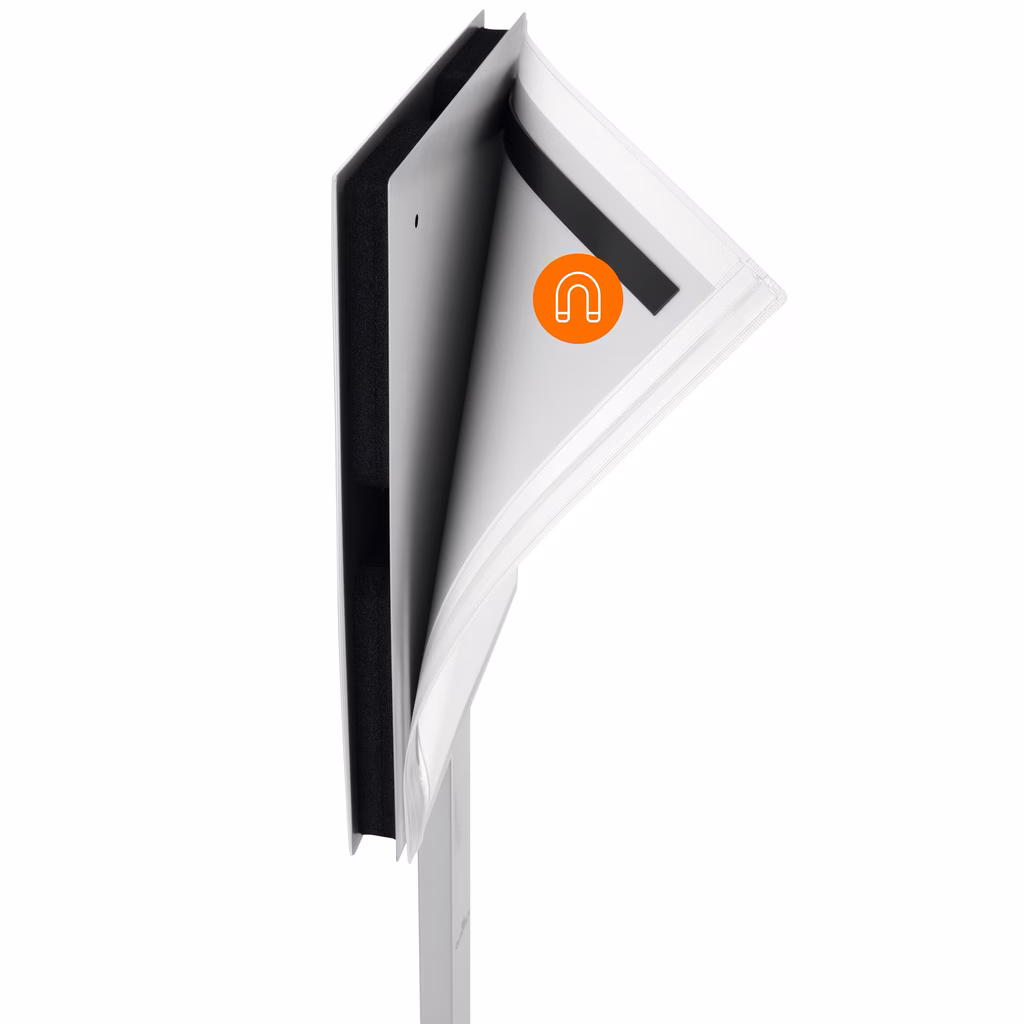 L'espositore da pavimento INFO STAND OUTDOOR è adatto sia alla presentazione di informazioni che come sistema di orientamento in ambienti interni ed esterni: dotato di buste con chiusura ermetica a pressione per la protezione degli inserti, soprattutto in caso di pioggia, elevata umidità e sporco. Buste testate secondo lo standard IPX5 (protezione contro i getti d'acqua provenienti da tutte le direzioni), dotate di pellicola trasparente con stabilizzatore UV e resistente alle intemperie, antigraffio con effetto antiriflesso. Facile fissaggio delle buste su entrambi i lati del pannello metallico grazie alle due bande magnetiche con elevata forza d'attrazione presenti sul retro (forza di attrazione: 0,95 N/cm2 per banda magnetica). Elevata stabilità grazie alla base a croce resistente alla corrosione che può essere ulteriormente appesantita con sacchi di sabbia o acqua. L'innovativo meccanismo ad incastro permette di posizionare il pannello espositivo in orizzontale o in verticale senza l'uso di minuteria. Buste impermeabili di ricambio acquistabili separatamente: cod. art. PU03211. Un'ampia gamma di modelli per gli inserti sono disponibili su www.duraprint.it Kit e istruzioni di montaggio inclusi nella confezione.