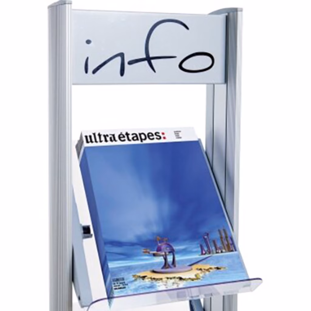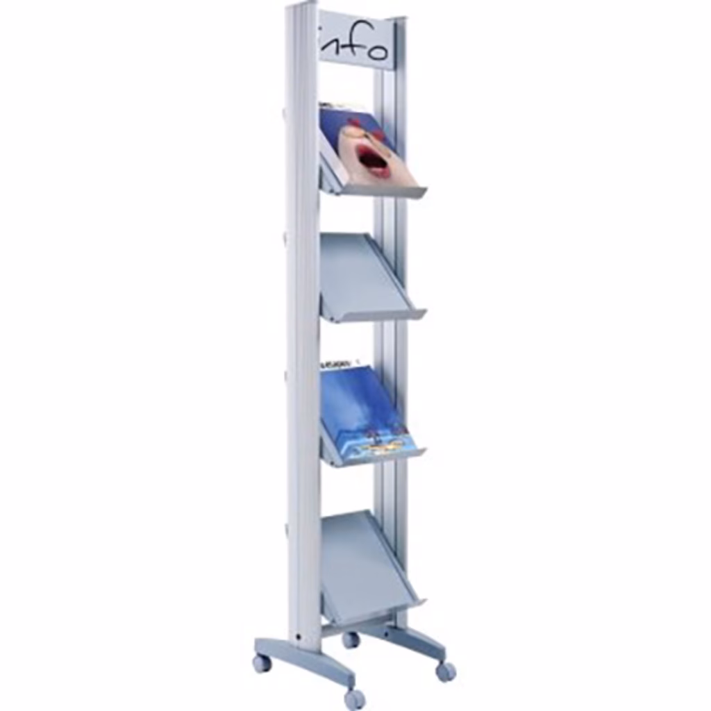 Elegante portariviste con struttura in alluminio e insegna personalizzabile in metallo, in alto fra i sostegni - ruote e profili in poliestere - 4 ripiani in metallo - completa visibilità dei documenti - Dimensioni cm 33x38,5x167,8 - ripiani cm 27,5x30