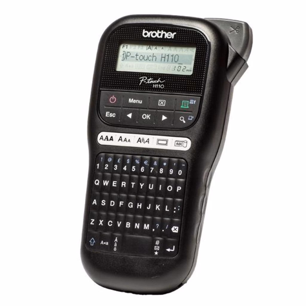 PT-H110 Etichettatrice palmareEtichettatrice elettronica palmare, design leggero e compatto, display di facile lettura, ideale per casa e ufficioP-touch H110 è l'etichettatrice ideale per l'ufficio o la casa grazie alle sue caratteristiche peculiari: display di facile lettura, design leggero e compatto che la rende facile da tenere in mano e da usare. Ampia possibilità di scelta nella personalizzazione delle etichette con la vasta gamma di nastri TZe dai 3,5 ai 12 mm, uno dei 3 stili di font disponibili e potendo scegliere tra oltre 253 simboli e 15 cornici decorative. E possibile utilizzare l'adattatore di corrente oppure le batterie alcaline AAA standard per la massima portabilità. Caratteristiche principali:Design ergonomico: facile da tenere in mano e da usareVelocità di stampa fino a 20 mm/secFunzionalità di Auto Design per etichette preconfigurate con cornici e simboliTasti funzione indipendenti per creare rapidamente le etichette3 font, 253 simboli e 15 cornici disponibili