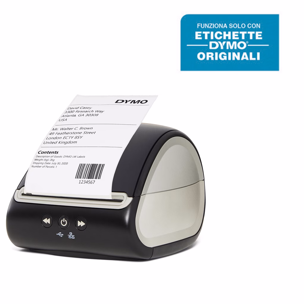 Stampante per etichette di spedizione XL per PC/Mac® con connessione LAN - nuova funzione di riconoscimento automatico delle etichette per riconoscere a colpo d'occhio dimensione, tipo e numero di etichette rimanenti - tecnologia di stampa termica diretta: nessun inchiostro o toner costoso richiesto - stampa in blocco da Microsoft Excel, Outlook e Google Contacts - etichette di spedizione XL - personalizzazione e stampa di etichette per indirizzi, archiviazione, codici a barre, badge nominativi e altro ancora grazie al software DYMO Connect for Desktop - Risoluzione 300 x 300 dpi - modalità automatica di sospensione per risparmio energetico