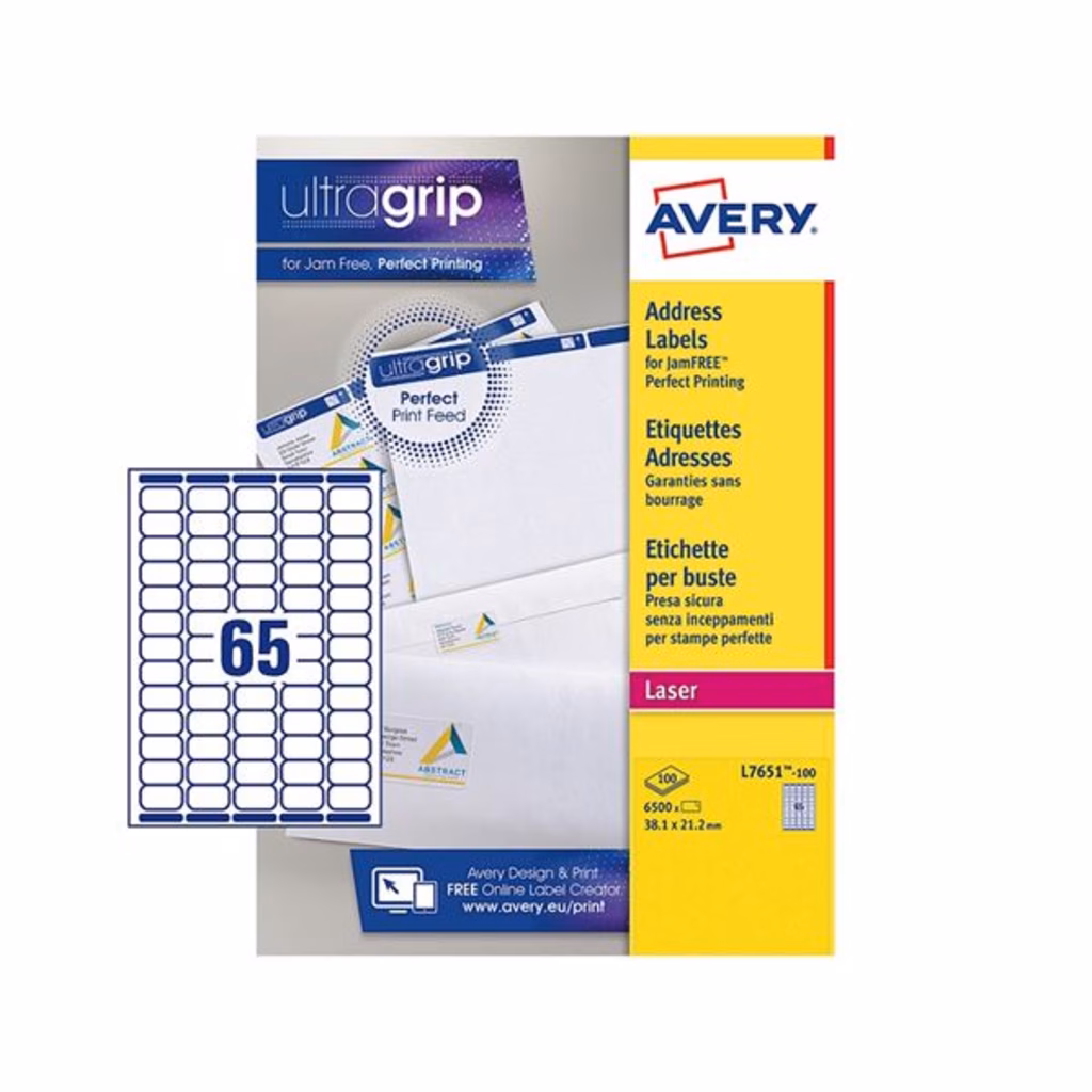 • Misura etichetta 38,1x21,2mm - 65 etichette per foglio - 100 fogli per confezione - 6500 etichette per confezione