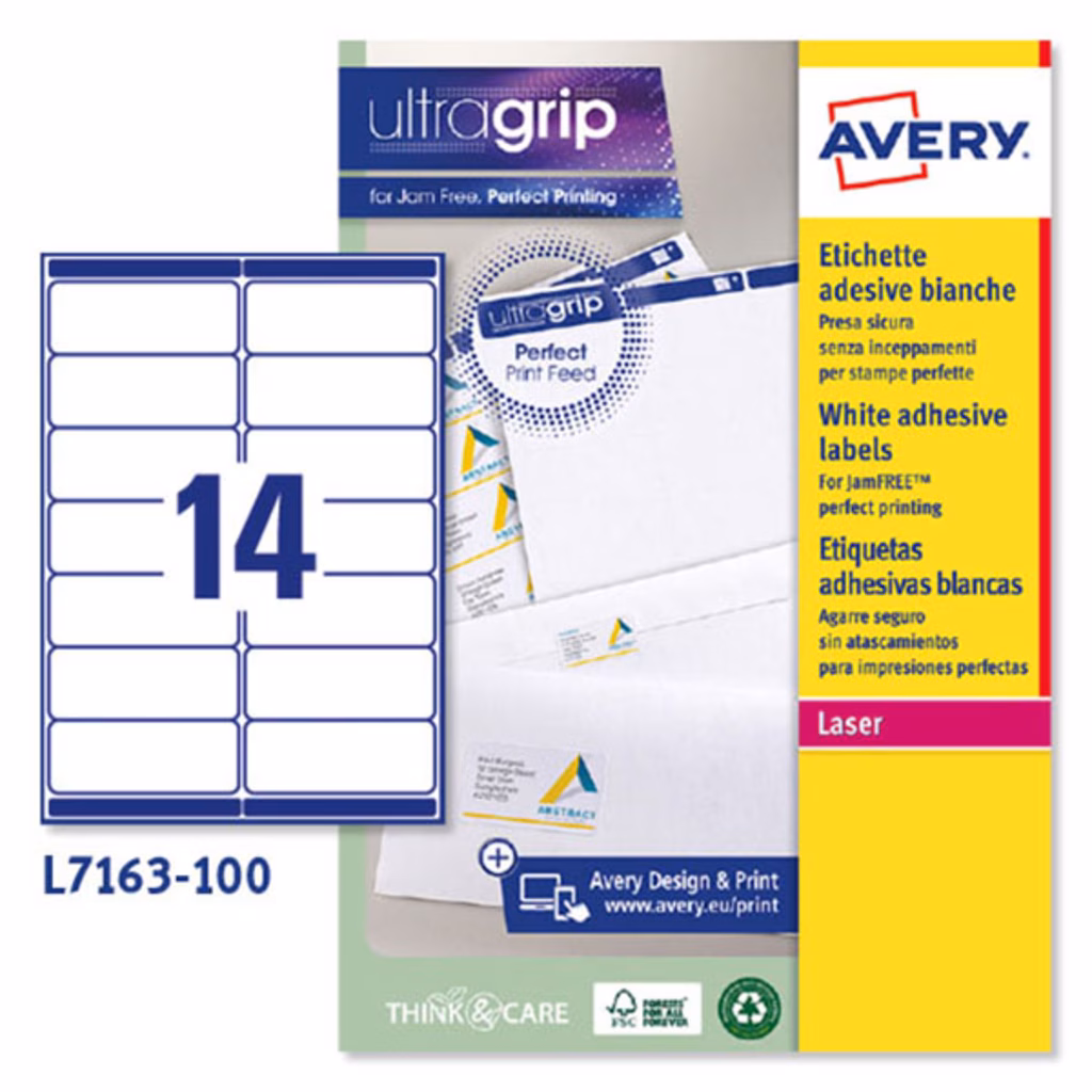 La tecnologia Ultragrip, la speciale banda blu presente sul foglio di etichette, permette di alimentare i fogli nella stampante in modo allineato e senza inceppamenti per stampe perfette e senza nessuno spreco. Le etichette sono facili da rimuovere dal supporto grazie alla tecnologia QuickPEEL che consente di strappare il foglio lungo una microperforazione liberando così un lato delletichetta. Questo prodotto è composto da materiale che proviene da foreste ben gestite, foreste certificate FSC® e da altre fonti controllate. Crea il tuo progetto di stampa in pochi clic con il software gratuito Crea e Stampa Online di Avery.  Tipo: etichette A4  Stampa: laser  Adesivo: permanente  Certificazione: FSC®