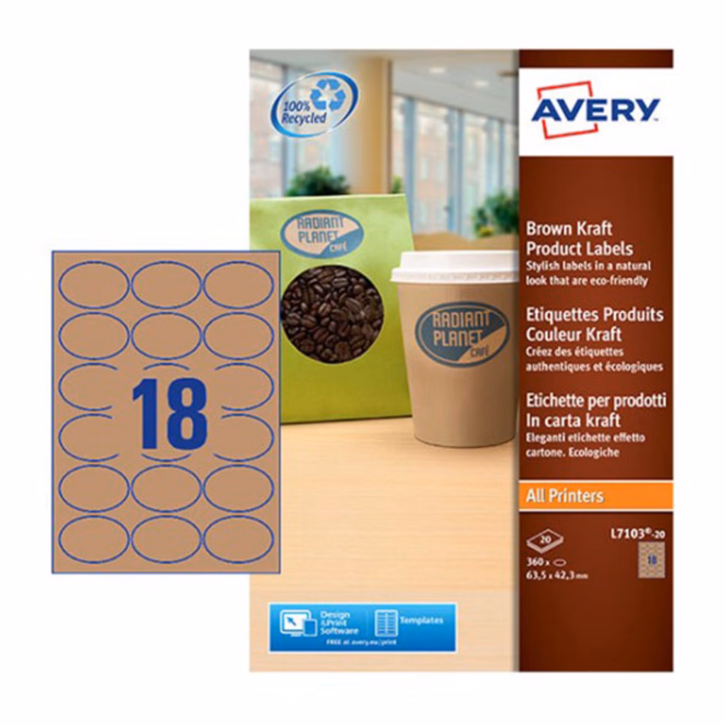 Etichette in carta kraft effetto cartone. Il materiale di origine forestale in questo prodotto è riciclato. Ideali per dare un aspetto naturale a prodotti e confezioni. Crea il tuo progetto di stampa in pochi clic con il software gratuito Crea e Stampa Online di Avery.