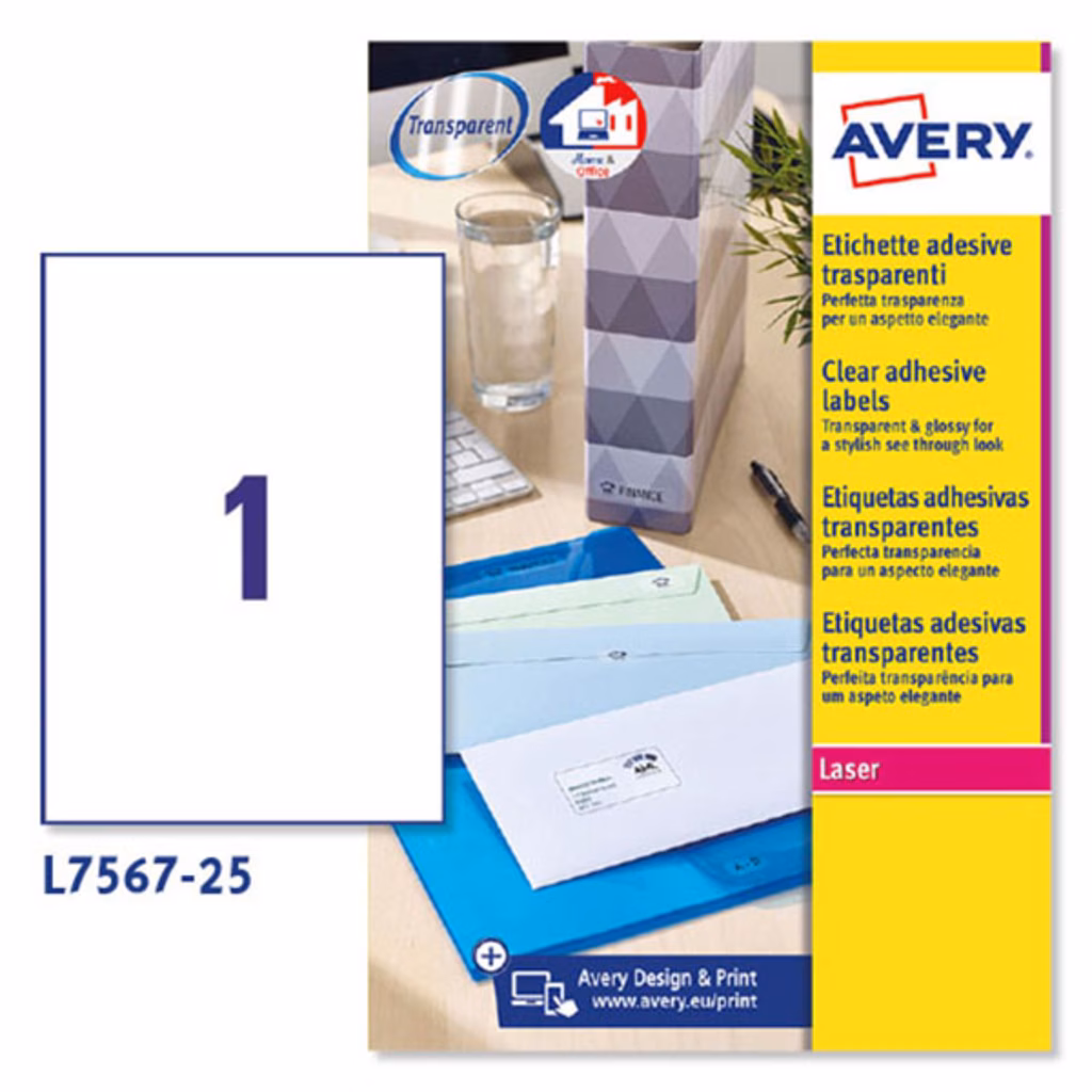 Etichette in poliestere trasparente, completamente invisibili. Una volta applicate si vede solo ciò che vi è stampato sopra. Le etichette sono facili da rimuovere dal supporto grazie alla tecnologia QuickPEEL che consente di strappare il foglio lungo una microperforazione liberando così un lato delletichetta. Possono essere applicate su vetro, metallo, cartone e plastica. Finitura lucida che dona un aspetto curato e professionale ai prodotti. Crea il tuo progetto di stampa in pochi clic con il software gratuito Crea e Stampa Online di Avery.