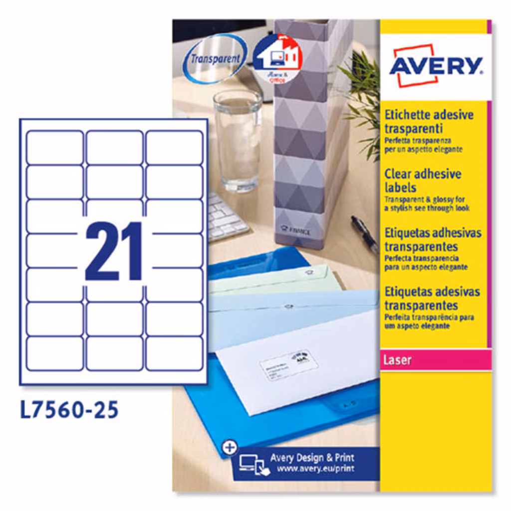 Etichette in poliestere trasparente, completamente invisibili. Una volta applicate si vede solo ciò che vi è stampato sopra. Le etichette sono facili da rimuovere dal supporto grazie alla tecnologia QuickPEEL che consente di strappare il foglio lungo una microperforazione liberando così un lato dell'etichetta. Possono essere applicate su vetro, metallo, cartone e plastica. Finitura lucida che dona un aspetto curato e professionale ai prodotti. Crea il tuo progetto di stampa in pochi clic con il software gratuito Crea e Stampa Online di Avery.