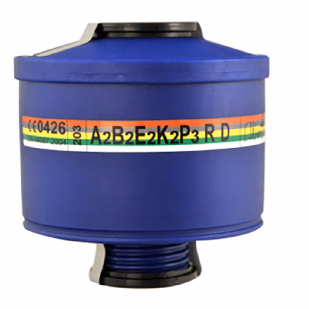 Filtro combinato a vite unificata EN 148-1 per vapori organici, gas e vapori inorganici. Il filtro può essere utilizzato con maschere TR82, TR2002 CL2 e TR2002 CL3, semimaschere ST 85 o similari, purché dotate di raccordo EN 148-1.
