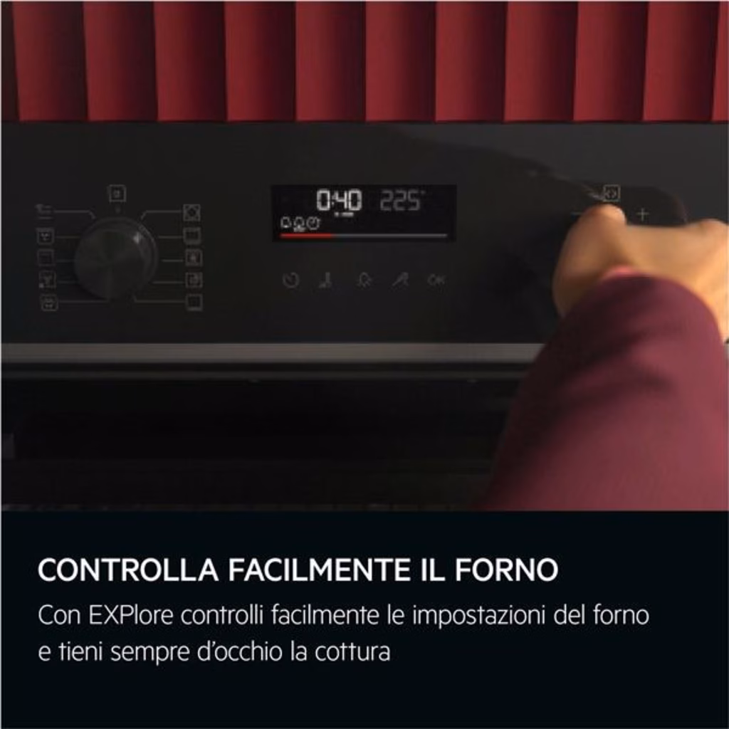 EXPlore con pulsanti touch. Per un controllo totale della cotturaIl display EXPlore consente di controllare senza sforzo le impostazioni del forno e di sapere cosa sta succedendo durante la cottura. Grazie al display a LED e ai tasti touch, è possibile visualizzare facilmente l ora, la temperatura e l avanzamento del piatto. Pulisci il tuo forno in modo naturale e semplice con Aqua Cleaning Pulisci il tuo forno in modo naturale e semplice con Aqua Cleaning. L'aggiunta di acqua nel forno crea vapore per sciogliere i residui ostinati rimasti sulla superficie, consentendo di rimuoverli facilmente con un panno umido.