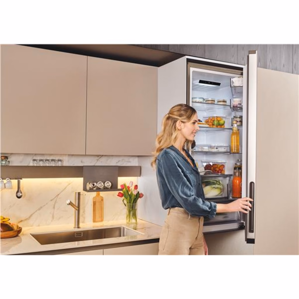 Il frigorifero si integra con il design della tua cucina: la cintura della porta dell'elettrodomestico si allinea perfettamente con il piano da lavoro, le cerniere non visibili consentono di posizionare il frigorifero anche negli spazi più stretti grazie all'apertura della porta che non va oltre i 90°.