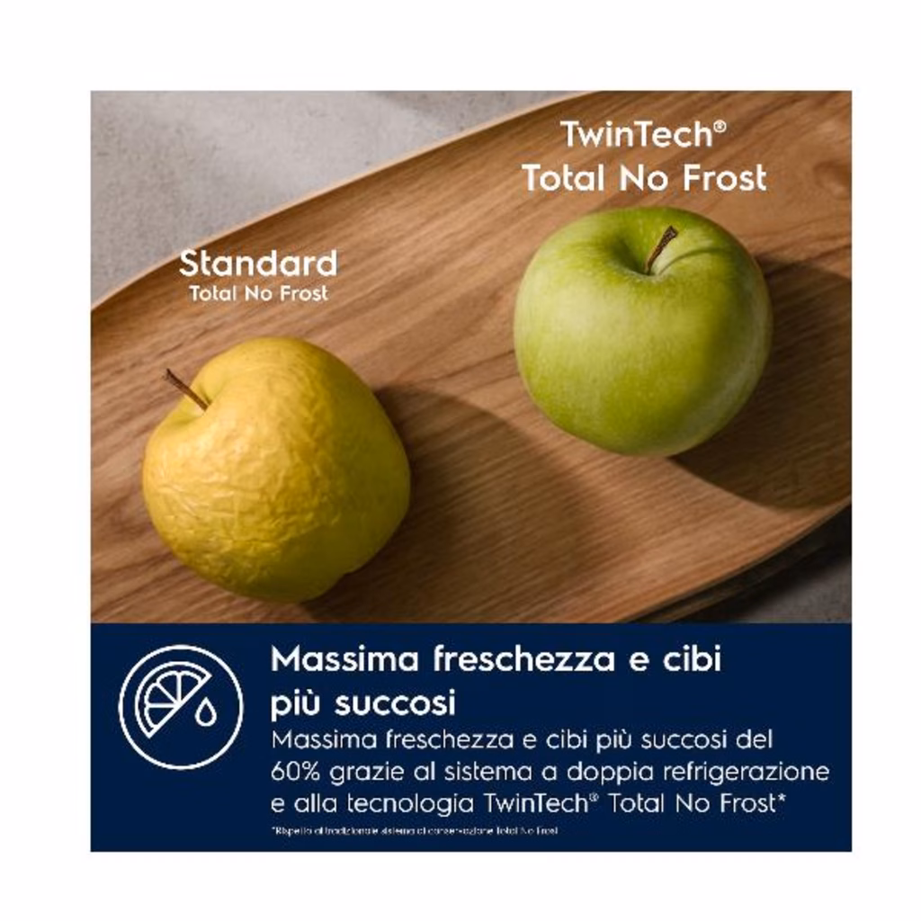 *Prova interna della tecnologia TwinTech® Total No Frost con un metodo di test interno che misura il livello di idratazione dopo nove giorni di conservazione rispetto a un altro prodotto di nostra produzione con un solo evaporatore.