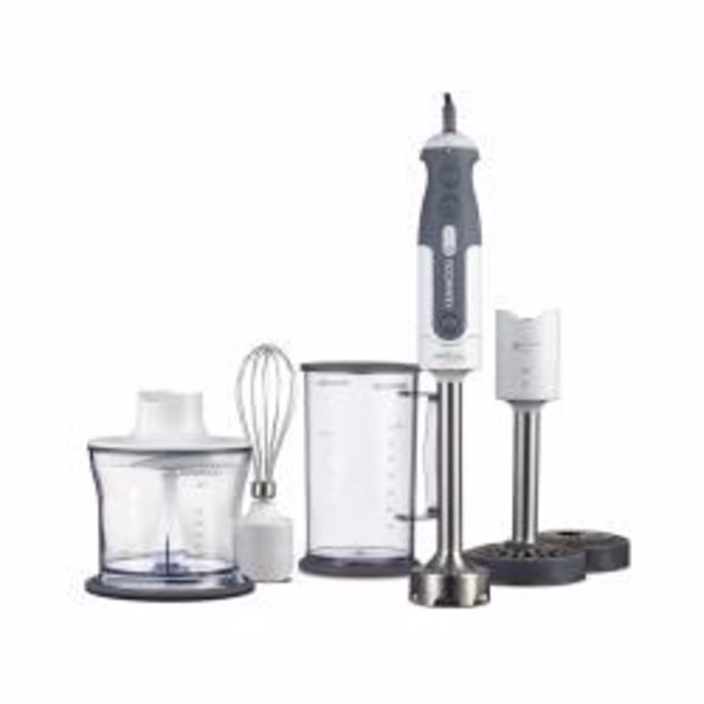 Il Frullatore ad immersione Triblade HDP404WH ha in dotazione uno schiacciapatate in metallo, un tritatutto da 0.5 litri e un bicchiere da 0.75 litri, una frusta in metallo e il controllo di velocità variabile.