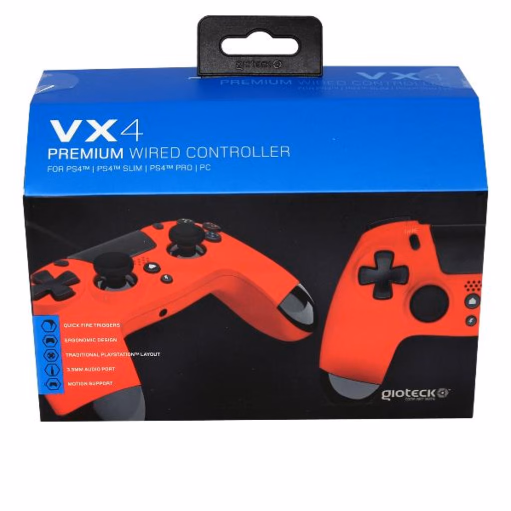 I controllers cablati VX-4 per PS4 offrono un comfort eccezionale durante le sessioni di gioco. Le leve a sgancio rapido, il D-Pad di precisione e gli stick in gomma antiscivolo consentono prestazioni di alto livello. Il motore incorporato produce diversi effetti di vibrazione che aumenta lautenticità ed il divertimento dei giochi attraverso il controller stesso.