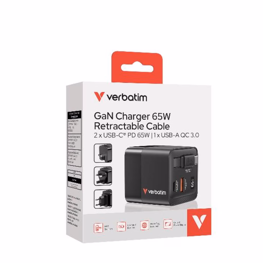Verbatim GaN Wall Charger 65W 2 Port with Retractable Cable