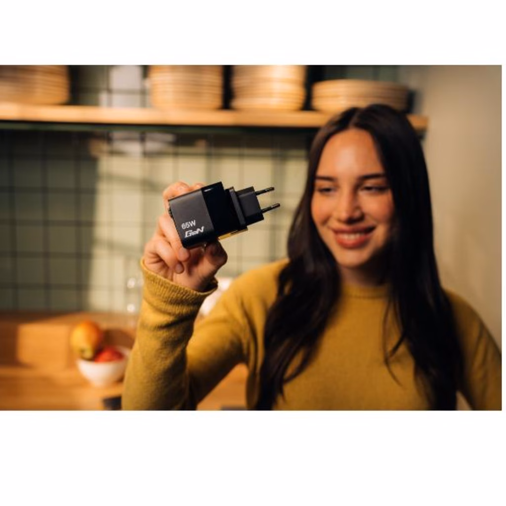 La tecnologia al nitruro di gallio (GaN) assicura un caricamento a elevata potenza, rapido ed efficiente, e genera meno calore. I caricabatterie GaN sono più piccoli e leggeri di quelli tradizionali a base silicio, il che li rende ultraportatili e ideali per gli spostamenti.