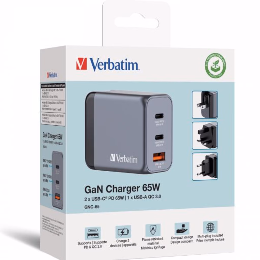 Il caricabatteria da parete GaN 65 W di Verbatim unisce due porte USB-C PD 65 W e una porta USB-A QC 3.0 in un design raffinato dalle dimensioni di un palmo della mano. Ideale per l'ufficio, la casa o in viaggio per alimentare il portatile, il tablet, lo smartphone, i dispositivi da gaming e altro ancora.