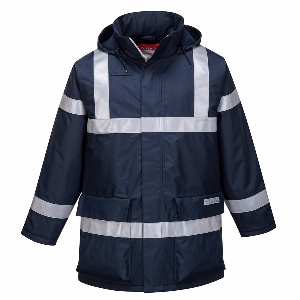 Giacca Bizflame multinorma Capo traspirante Certificato CE Banda riflettente ignifuga cucita Tasca interna sul petto Tasca per cellulare Anello radio Flap di chiusura frontale Cerniera frontale in plastica a doppio verso Antistatico Foderato Protezione chimica 4 tasche Tessuto impermeabile ignifugo Totalmente foderato e imbottito Impermeabile con cuciture nastrate