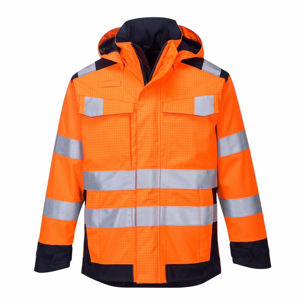 Giacca modaflame impermeabile multi norma arco elettrico PORTWEST MV70 colore arancione/blu navy tag