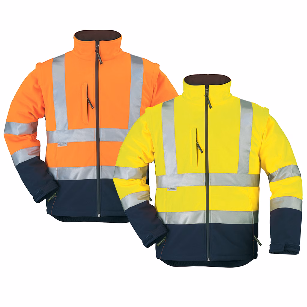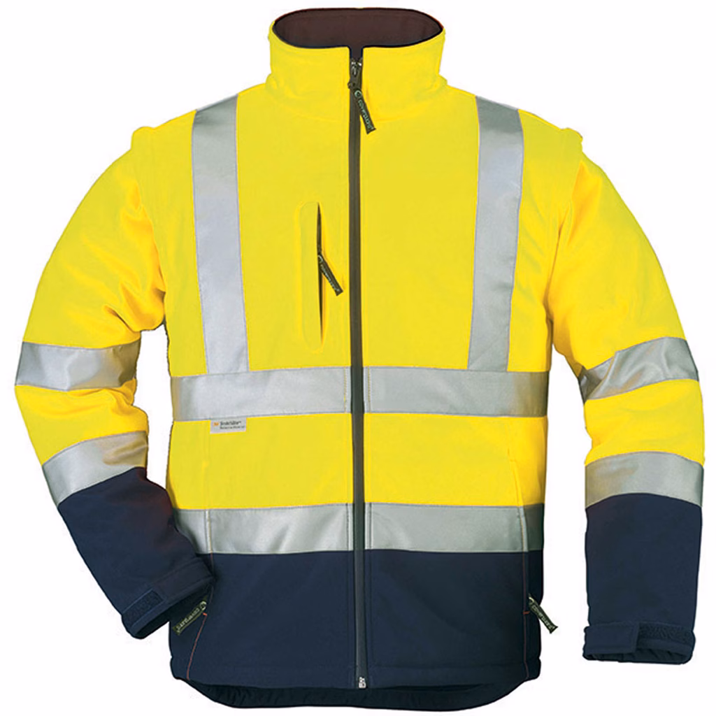 Giacca softshell ad alta visibilità in tessuto a 3 strati con membrana TPU e micropile da 300 g/m², impermeabile fino a 8000 mm e traspirante 3000 g/m²/24h, dotata di cappuccio a tre pezzi nascosto nel colletto e regolabile, maniche staccabili, chiusura centrale con zip, polsini regolabili con pattina a strappo, fondo regolabile con cordoncino, protezioni reni, inserti in contrasto su fondo e polsini, due tasche inferiori laterali e una tasca alta esterna tutte con zip, due tasche interne inferiori, bande retrorifrangenti cucite in microsfere di vetro (due cinture, due bracciali, due bretelle), certificata EN ISO 20471:2013 + A1:2016 Classe 3 dalla taglia M in su, DPI di categoria II.