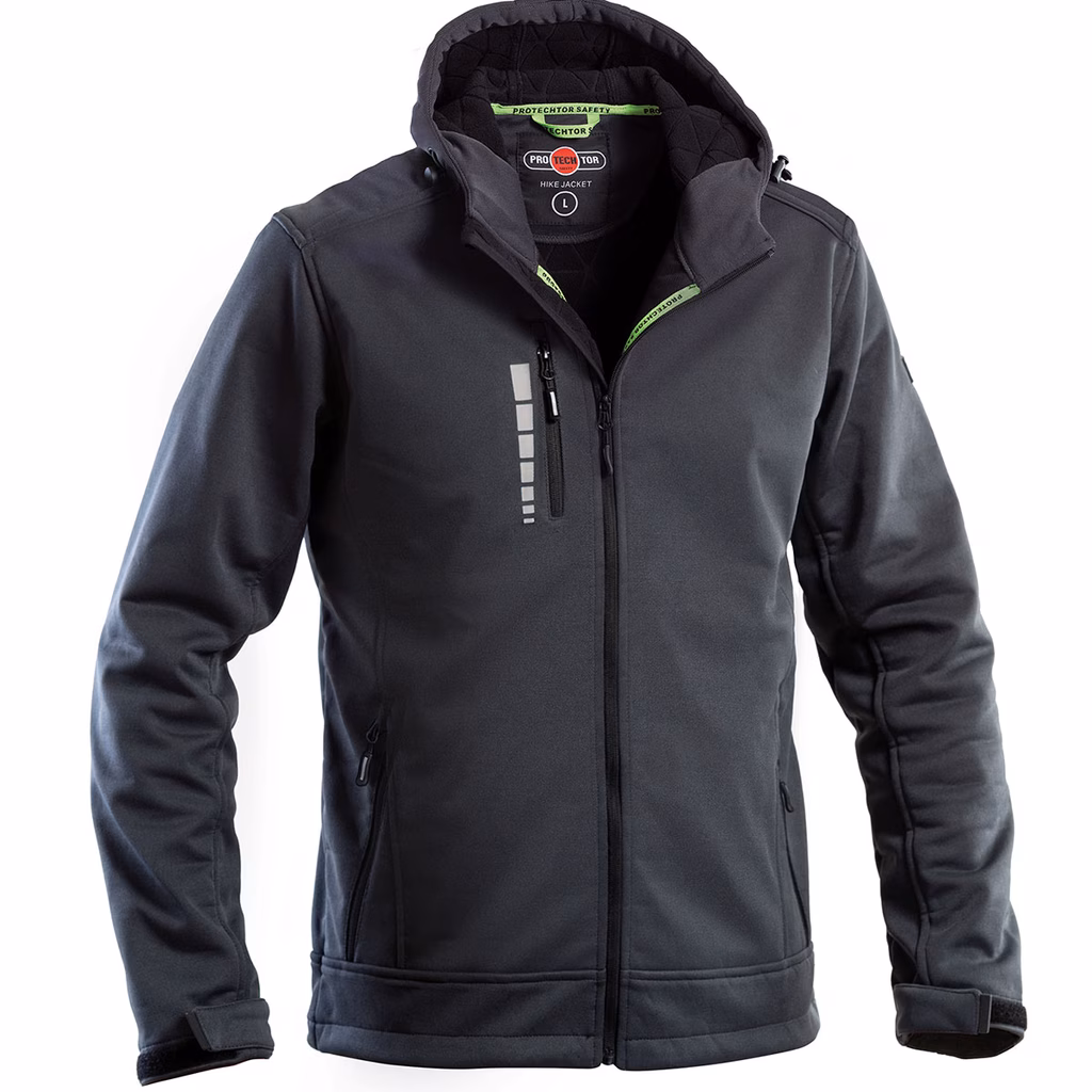 Giacca softshell sportiva con cappuccio a doppio fermacorda - design interno felpato con triangoli - impermeabile W/P 8000 mm e traspirante V/P 800 mm - piping rifrangente scuro sulle spalle - chiusura centrale con cerniera - 2 tasche infeRIOri chiuse con cerniera - 1 tasca al petto chiusa con cerniera e motivo rifrangente - 1 tasca interna chiusa con velcro - polsini regolabili con velcro - tirazip colore argento fluo - coulisse con doppio fermacorda per regolazione sul fondo - banda verde fluo interna dona luminosità e sportività al capo