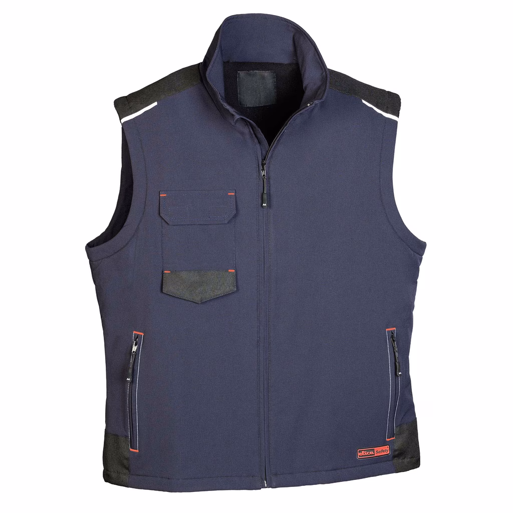 Gilet Montego in tessuto stretch 4-way idrorepellente ad alta traspirabilità e rapida asciugatura, con inserti in poliestere Oxford e fodera interna in pile, tasca sul petto con pattina e chiusura in velcro, due tasche con zip coperta, dettagli rifrangenti sulle spalle. Coordinato con Pantalone Elica Safety KINGSTON