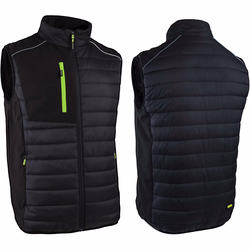 Gilet ibrido nero con struttura in nylon micro-ripstop e inserti in softshell a 3 strati per unelevata resistenza. Imbottitura in poliestere con tecnologia SORONA da 100 g/m², leggera ma calda. Dotato di collo alto in pile e chiusura centrale con zip e mentoniera. Presenta 1 tasca sul petto in softshell con cerniera, 2 tasche verticali inferiori con zip invisibili, e 1 tasca interna chiusa da velcro. Spalla, petto, fianchi e polsini rinforzati con softshell per maggiore robustezza. Dorso allungato per una protezione ottimale e piping retroriflettente sulle spalle per una migliore visibilità. Ideale come strato intermedio in contesti professionali esposti al freddo, è un capo versatile che unisce comfort, calore e libertà di movimento.