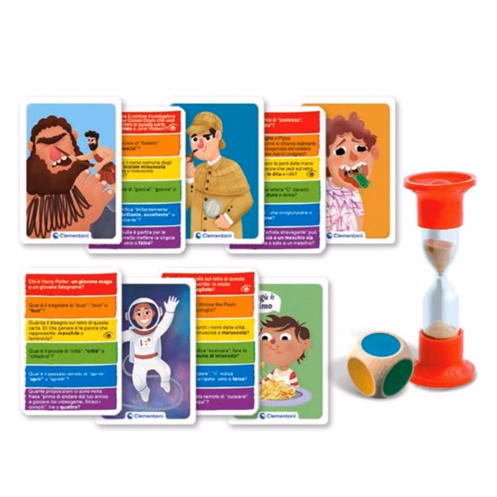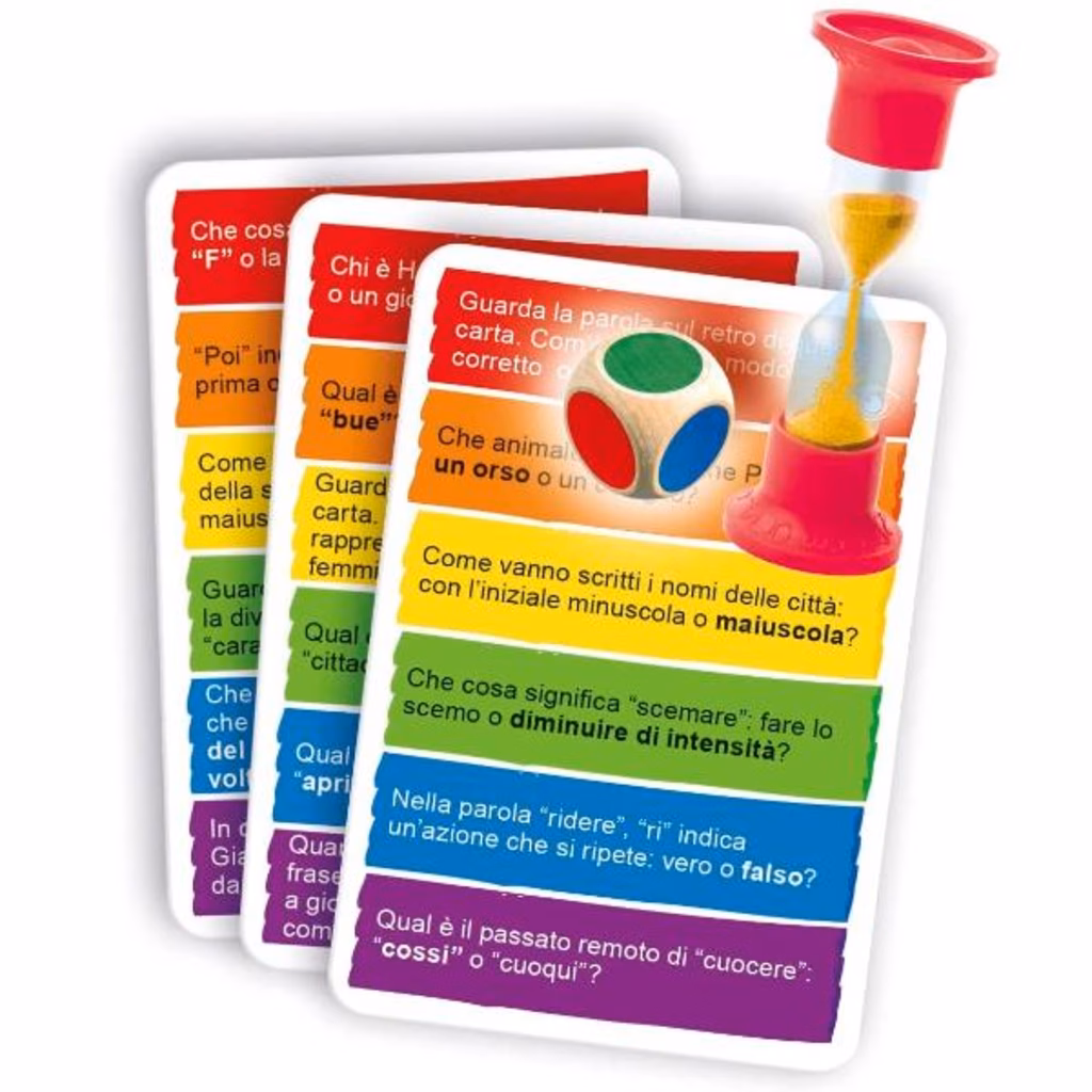 Carte quiz per sfidare gli amici in una divertente gara a tempo, rispondendo a divertenti domande sull'italiano.