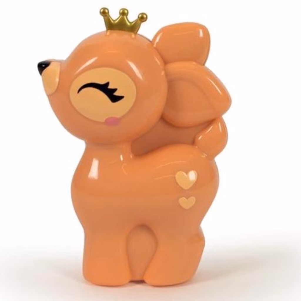 Il cerbiatto indossa una coroncina dorata così come gli altri cuccioli della linea, tutti da collezionare. Le forme delicate e lo sguardo tenero rendono la trousse preziosa e ambitissima dalle bambine.